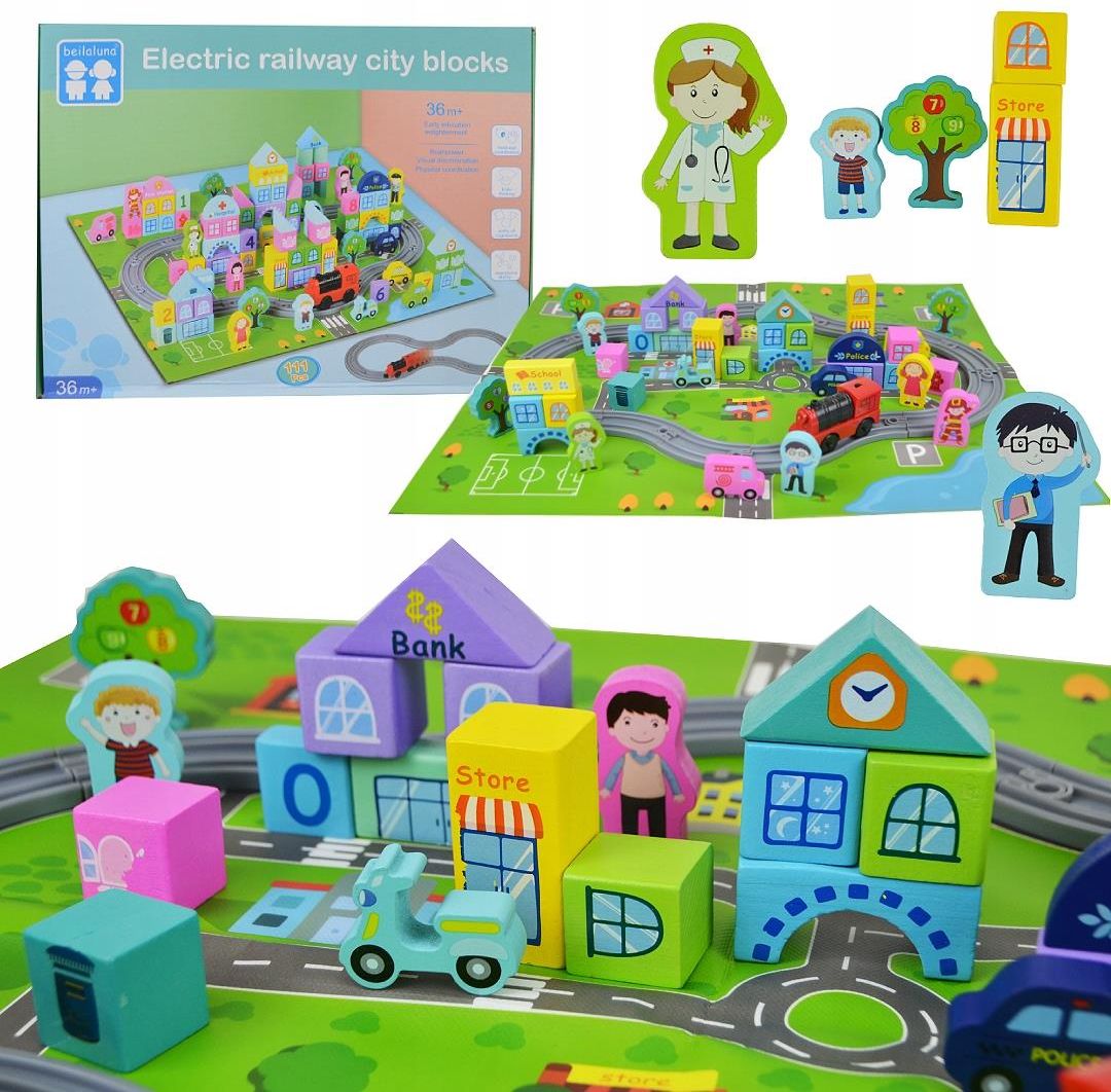 Drewniane Klocki "Moje miasto" 107 elementów Zestaw drewnianych klocków z matą w komplecie, to zabawka przeznaczona dla dzieci od trzeciego roku życia. Klocki wykonane zostały z drewna pokrytego bezpiecznymi, nietoksycznymi farbami. Na klocuszkach znajdują się obrazki budynków, pojazdów, drzew oraz osób, dzięki czemu maluszek może ułożyć na macie własne miasto. Układanie klocków wspiera intelektualny rozwój dziecka, rozwija wyobraźnię przestrzenną i kreatywność. wymiary maty ok. 60 x 50 cm, wymiary opakowania ok. 38,5 x 28,5 x 7,5 cm. Wiek: 3+ 16 elementów toru, pociąg, 90 klocuszków, mata, obrazkowa instrukcja.