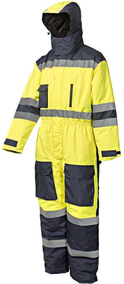 Cieply kombinezon o wyjatkowej widocznosci i wodoodpornosci do 2000 mm slupa wody. Bardzo przyjemna w dotyku strona wewnetrzna. górna czesc dodatkowo wylozona miekka podszewka. Zamek blyskawiczny wzdluz calego tulowia oraz nogawek umozliwia latwa wentylacje podczas wymagajacych prac. Produkt wyposazono równiez w kieszenie na piersiach z zamkiem blyskawicznym. kieszenie boczne. kieszenie przednie i odpinany kaptur ze sciagaczem sznurkowym. Kombinezon otrzymal certyfikat zgodnosci z norma EN 471.