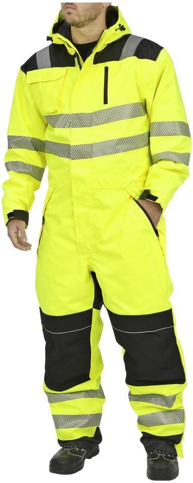 Ocieplany kombinezon z odblaskowej i wodoodpornej tkaniny z klejonymi szwami. Odblaski zapewniają dobrą widoczność podczas pracy po ciemku. Zapinany na dwustronny zamek kaptur, przyszyty na stałe, dwustronne zamki wzdłuż nogawek, fartuch przeciwśniegowy na dole nogawek oraz wzmocnienia na kolanach z kieszeniami na ochraniacze kolan.