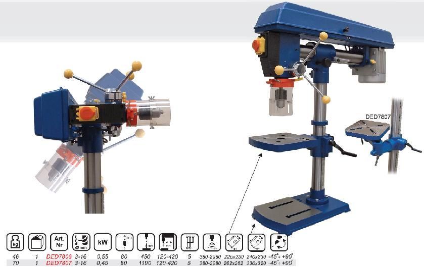 DANE TECHNICZNE: Numer katalogowy DED7807 Waga 70 Ilość w opakowaniu 1 Moc urządzenia 0,45 KW Zakres średnicy chwytu 3-16 Wymiary stołu roboczego górny 262x262, dolny: 330x320 Prześwit 1190 mm Regulacja w zakresie 120-420 Ilość biegów 5 Skok wrzeciona 80 mm Prędkość obrotowa wrzeciona Wier. 380-2980 Położenie głowicy -45st. - +90st.