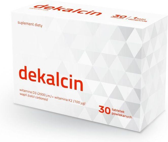 Suplement diety Dekalcin, stanowiący źródło naturalnej witaminy K i D3 oraz wapnia. Witamina K2, D3 oraz wapń pomagają w utrzymaniu zdrowych kości. Witamina D3 pomaga w prawidłowym funkcjonowaniu układu odpornościowego jak również utrzymuje prawidłowy poziom wapnia we krwi. Witamina K oraz wapń przyczyniają się do prawidłowej krzepliwości krwi. Wapń wspiera funkcjonowanie enzymów trawiennych i pracę mięśni. Utrzymuje prawidłowe przekaźnictwo nerwowe, metabolizm energetyczny oraz bierze udział w procesie podziału komórek. Zastosowanie: uzupełnienie diety w składniki aktywne preparatu. Zalecane spożycie: 1 kapsułka dziennie. Składniki: wapń (węglan wapnia), substancja wypełniająca celuloza otoczka (substancja glazurująca hydroksyprometyloceluloza, barwnik dwutlenek tytanu, emulgator: glikol polietylenowy, substancja wypełniająca celuloza, substancja przecwzbrylujaca: talk, emulgator, polisorbat 80), witamina D (cholecalcyferol), substancja wypełniajaca sól sodowa karboksymetylocelulozy usieciowana, witamina K (menachinon) substancja przeciwzbrylująca sole magnezowe kwasów tłuszczowych. 1 kapsułka zawiera: witamina K2 (menachinon-7) 100μg (125%) *, witamina D3 (cholekalcyferol) 50μg (2000 j.m.) (1000%)*, wapń 400mg (50%)*. *RWS - Referencyjna Wartość Spożycia. Ważne wskazówki: Suplement diety nie może być stosowany jako substytut (zamiennik) zróżnicowanej diety. Zrównoważony sposób żywienia i prawidłowy tryb życia jest ważny dla funkcjonowania organizmu człowieka. Nie należy przekraczać zalecanej dziennej porcji. Przechowywać w temperaturze pokojowej poniżej, w sposób niedostępny dla małych dzieci. Nie przyjmować w przypadku uczulenia na którykolwiek ze składników preparatu. W przypadku przyjmowania leków przeciwzakrzepowych należy przed zastosowaniem preparatu skonsultować się z lekarzem.
