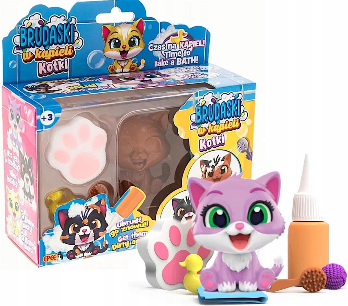 Brudaski w kąpieli Kotki Zestaw Bonusowy Kotek Fiołek błotko akces EPEE Brudaski w Kąpieli – Kotki to wyjątkowa kolekcja figurek, które można brudzić specjalnym błotkiem, myć i zaczynać zabawę od nowa! Każdy kotek ma specjalną powłokę, dzięki której brudek znika w mgnieniu oka, a dołączone akcesoria sprawiają, że kąpiel staje się jeszcze ciekawsza. Jak to działa? Ubrudź kotka specjalnym błotkiem – zobacz, jak zmienia wygląd! Użyj dołączonych akcesoriów, by go umyć – gąbeczka i szczotka pomogą w kąpieli. Osusz i przytul czystego kotka – a potem… znów zacznij zabawę od początku! Dlaczego Brudaski w Kąpieli to hit? Interaktywna zabawa – brudzenie i mycie kotka to nieskończona frajda! Rozwija wyobraźnię i zdolności manualne – dzieci mogą tworzyć własne historie i wcielać się w rolę opiekunów zwierzątek. Zachęca do dbania o higienę – zabawa w kąpanie kotków uczy troski o czystość w naturalny sposób. Idealny prezent – dla małych miłośników zwierzątek i kreatywnej zabawy! Zawartość zestawu 1 figurka kotka – do wyboru 9 różnych bohaterów: Fiołek, Tytus, Puszek, Lusia, Tofik, Łatek, Lili, Karmelek, Rózia 1 tubka z błotkiem – do zabawy w brudzenie kotka 5 akcesoriów kąpielowych: gąbeczka, szczotka, kaczuszka, kłębek, ręczniczek Brudne łapki? Czyste futerko? A może znów kąpiel? Niezliczone możliwości zabawy czekają! Wymiary opakowania: 15 x 15 x 6 cm Wiek: 3+