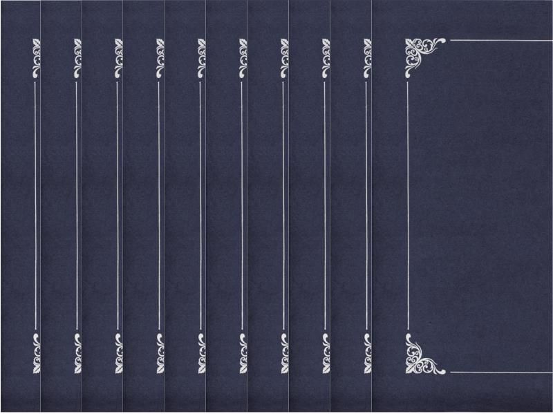 Teczka ozdobna ARGO A4 ze srebrną ramką granatowa 10 sztukElegancka oprawa dyplomów, chroniąca je przed czynnikami zewnętrznymi i uszkodzeniami. Teczka wykonana z metalizowanego kartonu tekturowego Iceland w kolorze granatowymCechy:- Elegancka oprawa dyplomów.- Rodzaj materiału tektura- Wykonana z kartonu gładkiego- Srebrna ramka- Z wąskim grzbietem, trzy skrzydłowa- Kolor: granatowy - Opakowanie: 10 sztuk