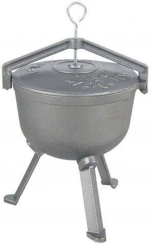 Żeliwny kociołek myśliwski to wyśmienity sposób na przyrządzanie posiłków na świeżym powietrzu - na biwakach, kempinagach. Przygotowanie gulaszu, pysznego bigosu czy wojskowej grochówki nad "żywym ogniem" nie nastręczy już żadnych kłopotów. Żeliwo dosko. Kociołek wykonany jest z żeliwnego odlewu. Żeliwo ze względu na swoje właściwości jest jednym z najznakomitszych materiałów do produkcji naczyń kuchennych. Potrawy przygotowywane przy użyciu żeliwnych naczyń nabierają niezwykłego smaku. Kociołek ma pojemności 4,5 litrów, taka pojemność pozwala na przyrządzanie potraw do 8-10 osób. Naczynie posiada 3 nóżki, które można odkręcić, aby można było zawiesić je na trójnogu. Pokrywa kociołka wyposażona jest w uchwyt dokręcający, który ją stabilizuje. Pokrywa sprawia, że dania gotują się równomiernie oraz zapobiega ona zanieczyszczeniu potraw przez kurz, pył.