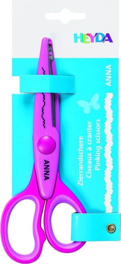 Nożyczki dekoracyjne Anna do wycinania wzorów w papierze, długość 16,5 cm Heyda Ozdobne nożyczki ANNA firmy Heyda są idealne do dodawania dekoracyjnych brzegów zdjęciom, albumom, kartkom okolicznościowym i innym projektom plastycznym i scrapbookingowym. Posiadają ostrza ze stali nierdzewnej w kształcie regularnych ząbków, osadzone w trwałej, wygodnej plastikowej rączce, zapewniając bezpieczne używanie. Narzędzie umożliwia precyzyjne cięcie w papierze, cienkiej tekturze, bibule itp., tworząc skomplikowane dekoracyjne wzory. Doskonale sprawdzają się w scrapbookingu, tworzeniu kartek i ozdób. Zarówno dzieci, jak i profesjonaliści w dziedzinie plastycznej mogą korzystać z tych nożyczek, aby w łatwy i szybki sposób nadać brzegom papierowych elementów wyjątkowe zdobienie. Wnętrze uchwytów na palce wyłożone jest gumą, co zapewnia wygodę i zapobiega obtarciom podczas dłuższego użytkowania.