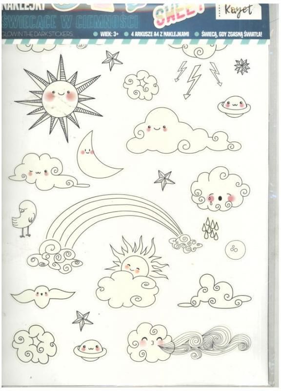 Naklejki świecące w ciemności idealne do dekoracji zeszytów, teczek i artykułów szkolnych. Opakowanie zawiera 4 arkusze A4 z naklejkami. Każdy arkusz zawiera kilkadziesiąt naklejek