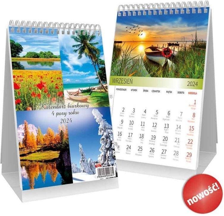 Opis produktu: Kalendarz biurkowy „Cztery pory roku” na 2024 rok Niniejszy kalendarz biurkowy prezentuje się w formatę 11 x 17,5 cm i składa się z 13 stron. Zawiera 12 stron kalendarza plus okładkę, dzięki czemu można śledzić daty przez cały rok. Część kalendarium wykonana jest na błyszczącym papierze kreda o gramaturze 110g. Z kolei okładka została wydrukowana na papierze kreda o gramaturze 150g i ozdobiona błyszczącą folią, co nadaje jej atrakcyjności. Wszystkie informacje w kalendarzu są w języku polskim, co ułatwia orientację. Kalendarium zawiera podwójne imieniny i numerację tygodni, co jest szczególnie przydatne do planowania. Oprawa tego kalendarza biurkowego jest wyjątkowa: grzbiet zaciskany spiralą jest przytwierdzony do sztywnego kartonu, który można łatwo formować w trójkątną podstawę. Taki design sprawia, że kalendarz stabilnie stoi na każdym biurku. EAN: 5906408000381