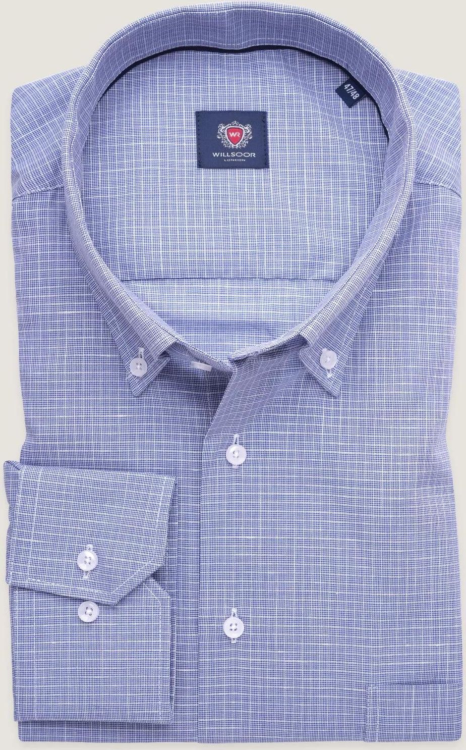 Klasyczna, niebieska koszula w delikatną, białą kratkę z podpinanym kołnierzykiem i kontrastowymi guzikami, 100% bawełna