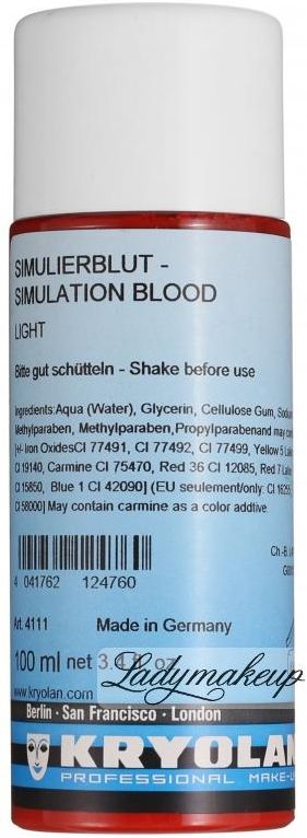 KRYOLAN - SIMULATED BLOOD - Sztuczna krew - 100 ml - ART. 4111 - DARK Aukcja dotyczy koloru/rozmiaru/fasonu: DARK SIMULATED BLOOD marki KRYOLAN. Sztuczna krew do rekwizytów. Opracowana z myślą o wykorzystaniu w filmach, teatrze, sesjach zdjęciowych, szkoleniach medycznych oraz wszelkiego rodzaju efektach specjalnych, gdzie wymagana jest realistyczna symulacja krwi. Nadaje bardzo realistyczny efekt. Produkt nie jest całkowicie zmywalny z tkanin, ale bez problemu zmywa się z powierzchni gładkich. Krew Kryolan dostępna jest w dwóch odcieniach. Butelka z produktem ma pojemność 100 ml. Sztuczna krew. Nadaje bardzo realistyczny efekt. Do wykorzystania w filmach przy efektach specjalnych. Łatwa do usunięcia z gładkich powierzchni.