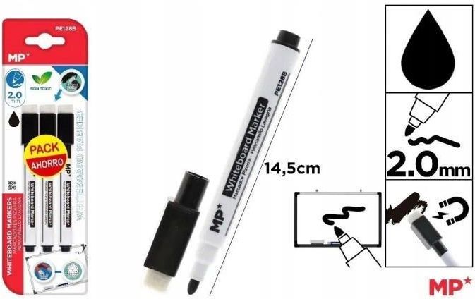 Marker do tablic 3szt czarny MP Main Paper __________________________________________________________________ W komplecie marker do tablic sucho ścieralnych z plastikowym korpusem i nasadką w kolorze tuszu z gumką.Nietoksyczny tusz, który można łatwo ze trzećsz matką lub gumką do tablic sucho …