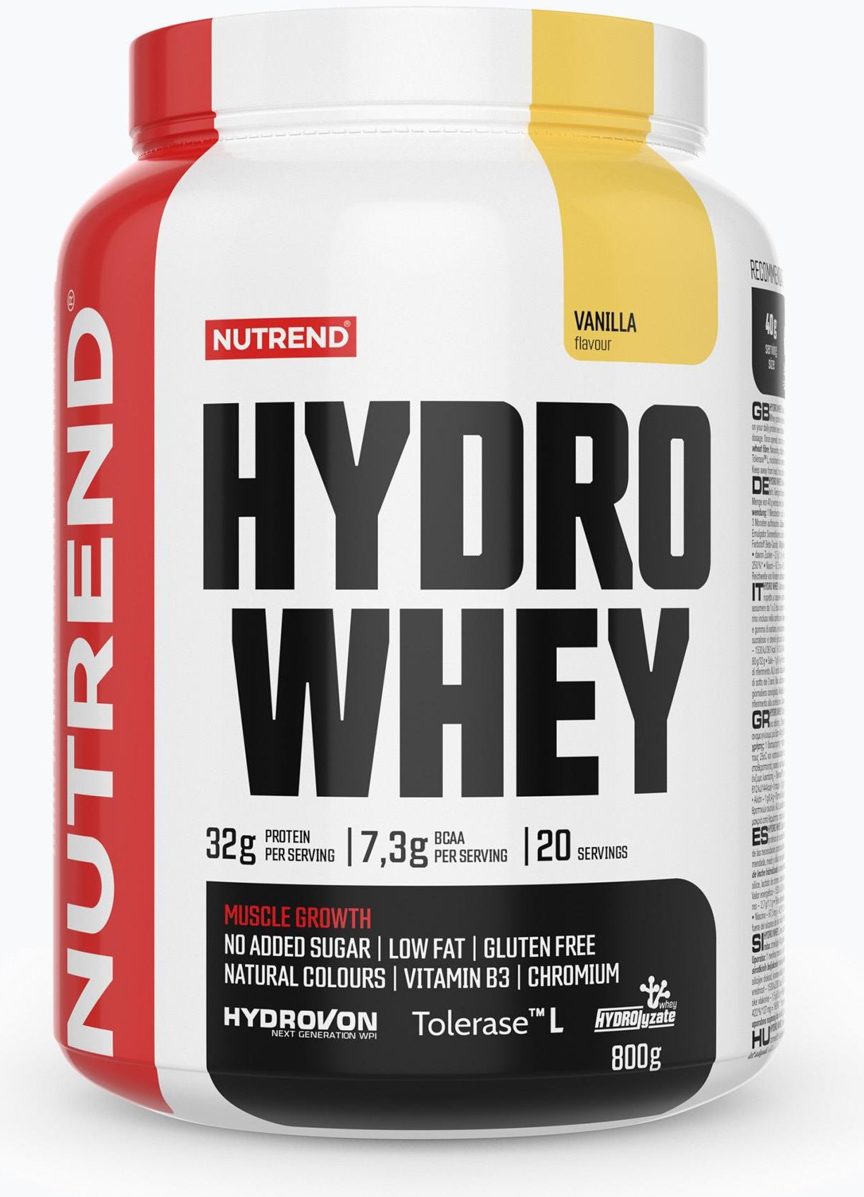 Natywny izolat białka serwatkowego o wysokiej wartości biologicznej i maksymalnej wchłanialności wzbogacony jest o enzym laktazę, bez dodatku cukru. Wyróżnia się wyjątkową strawnością i szybkim dostarczaniem niezbędnych aminokwasów do wysokiej jakości regeneracji mięśni. * 80% białka * markowy WPI Hydrovon * 100% hydrolizowany WPI * 32 g białka w jednej porcji *enzym laktaza Tolerase™ L * chrom *witamina B3 *bez dodatku cukru *bez sztucznych barwników - bez glutenu Najwyższej klasy i markowy hydrolizowany izolat białek serwatkowych Hydrovon™, który dzięki delikatnej hydrolizie nie traci swojej wartości biologicznej i wyróżnia się świetnym spektrum aminokwasów. Kolejnym markowym składnikiem tego produktu jest Tolerase®L. Jest to kwaśna forma enzymu laktazy, która pomaga rozkładać cukier mleczny (laktozę) nawet w środowisku przewodu pokarmowego, co jest niekorzystne dla normalnego enzymu laktazy. HYDRO WHEY zawiera 80% najwyższej klasy białka i zerową ilość cukrów, z wyjątkiem tych naturalnie występujących. Do barwienia produktu stosowane są wyłącznie naturalne barwniki, a wspaniałego smaku nadają mu wyłącznie stewia i sukraloza. Produkt HYDRO WHEY wyróżnia się wyjątkową strawnością i zaspokaja potrzeby wszystkich sportowców, zarówno na poziomie amatorskim, jak i najbardziej wymagających profesjonalistów z każdej branży sportowej. Każdy, kto potrzebuje produktu najwyższej klasy, o wysokiej zawartości łatwo przyswajalnego białka, ma teraz HYDRO WHEY!Można go bardzo łatwo wymieszać z czystą wodą za pomocą shakera Nutrend.Hydrolizat białek serwatkowych przeznaczony do uzupełnienia wysokiej jakości, łatwo przyswajalnego białka w ciągu dnia. Zalecane dawkowanie: dawkę 40 g rozpuścić w 240 ml wody. W zależności od dziennego zapotrzebowania na białko spożywać 1-2 porcje dziennie, pomiędzy posiłkami. Maksymalna dzienna dawka wynosi 80 g.Uzywać:* 16 g = 1 miarka dla smaku waniliowego i truskawkowego. * 18 g = 1 miarka dla smaku czekoladowego. Odmierz i wymieszaj w shakerze zgodnie z zalecaną dawką. Po otwarciu przechowywać w temperaturze do 25°C i spożyć w ciągu 3 miesięcy. Uwaga: Mieszanka do przygotowania aromatyzowanego napoju bezalkoholowego z dodatkiem witaminy B3 i chromu, zawierająca substancje słodzące. Szczególnie odpowiedni dla sportowców. Nie jest przeznaczony dla dzieci, kobiet w ciąży i karmiących piersią. Przechowywać w miejscu niedostępnym dla dzieci! Chronić przed mrozem, gorącem i wilgocią.