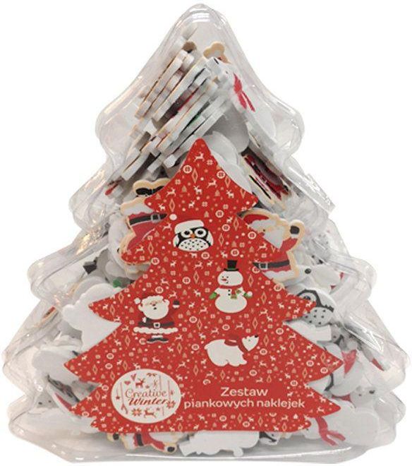 naklejki ozdobne, świąteczne mix wzorów zapakowane w ozdobne pudełko w kształcie choinki materiał: pianka Produkt poekspozycyjny lub końcówka magazynowa. Może posiadać nieznaczne uszkodzenia opakowania (np. metki cenowe, przybrudzenia, zarysowania, zagięcia, naddarcia), które nie wpływają na funkcjonalność produktu.