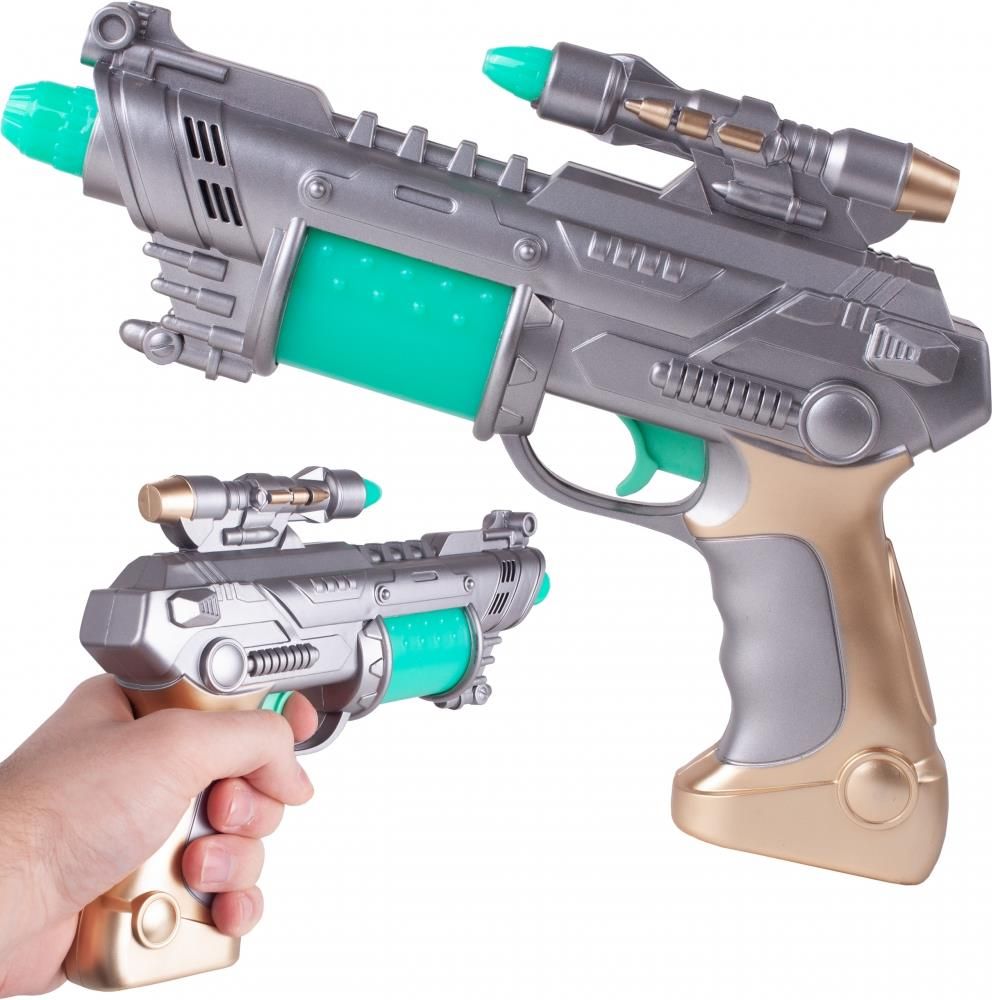 PISTOLET DLA DZIECI KOSMICZNY GALAXY FORCE Każdy chłopiec jak i dziewczynka lubią galaktyczne niesamowite rzeczy! Miks połączeń kolorostycznych i ogłosów wydawanych przez pistolet sprawia iż zabawa jest ogromnie fantastyczna! Broń wydaje odgłos strzelania i świeci, a bęben z światełkami obraca się, dzięki czemu powstają wibracje. Doskonale sprawdzi się podczas zabaw twoich dzieci z przyjaciółmi. Wszystkie zabawki sprzedawane w naszym sklepie posiadają niezbędne certyfikaty CE. Zabawka sprzedawana wraz z opakowaniem.