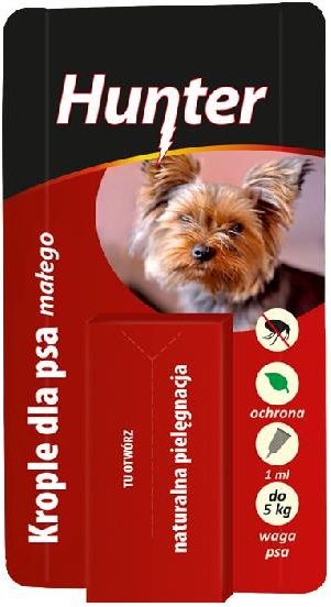 Krople przeciw pchłom dla małego psa Hunter Hunter · krople przeciw pchłom dla małych psów do 5 kg · wygodny i skuteczny środek do ochrony i pielęgnacji · przeznaczony dla psów i szczeniąt wszystkich ras, także tych z delikatną sierścią i skórą · składniki zawarte w kroplach mają bardzo dobre właściwości pielęgnacyjne, tonizujące i łagodzące podrażnienia skóry · uzupełniające skład witaminy działają odżywczo i regenerująco · środek nabłyszczający nadaje sierści doskonały wygląd i połysk oraz ułatwia rozczesywanie · krople pozostawiają po użyciu przyjemny zapach · produkt w 100% pochodzenia naturalnego · opakowanie: 1 ml · krople przeciw pchłom dla małych psów do 5 kg · wygodny i skuteczny środek do ochrony i pielęgnacji · przeznaczony dla psów i szczeniąt wszystkich ras, także tych z delikatną sierścią i skórą · składniki zawarte w kroplach mają bardzo dobre właściwości pielęgnacyjne, tonizujące i łagodzące podrażnienia skóry · uzupełniające skład witaminy działają odżywczo i regenerująco · środek nabłyszczający nadaje sierści doskonały wygląd i połysk oraz ułatwia rozczesywanie · krople pozostawiają po użyciu przyjemny zapach · produkt w 100% pochodzenia naturalnego · opakowanie: 1 ml