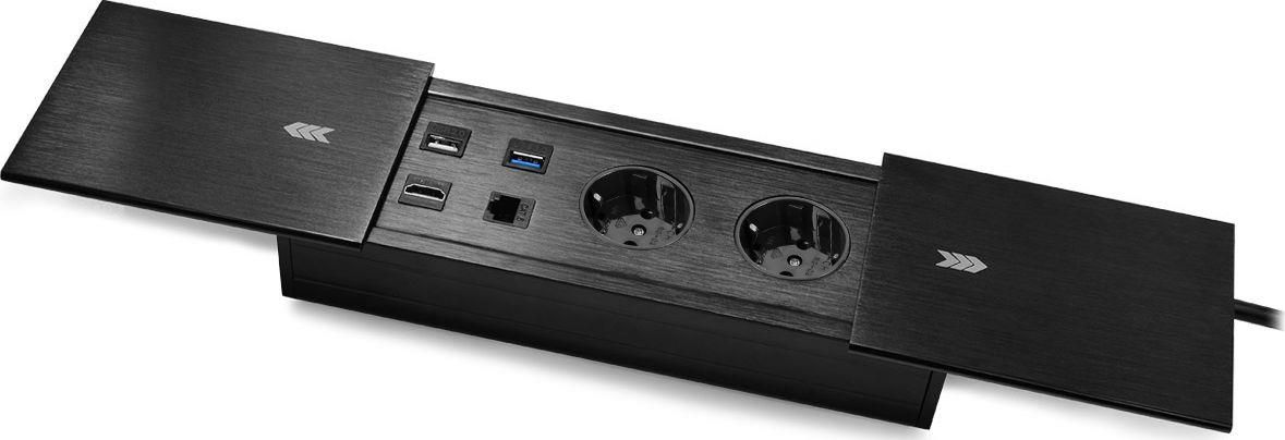 Gniazdo blatowe zasuwane Spacetronik SPS-S26B V2 (czarny) Mediaport Spacetronik ERGOLINE SPS-S26B V2 to nowoczesne rozwiązanie, które znajduje zastosowanie w sklepach, salonach sprzedaży, salach konferencyjnych, biurach, a także w domu. Wykonany z aluminium i wysokiej jakości komponentów. Produkt jest przeznaczony do montażu wewnątrz pomieszczeń w biurkach, blatach i stołach, zarówno w pozycji pionowej jak i poziomej, zapewniając dostęp do gniazd. Oprócz standardowych gniazd zasilających (Schuko) posiada także porty USB 3.0, USB 2.0, HDMI oraz gniazdo Ethernet RJ-45, a wszystko to przykrywają dwie zasuwane aluminiowe pokrywy. Elegancki i nowoczesny design Seria mediaportów Spacetronik wyróżnia się niebanalnym designem, który sprosta potrzebom nawet tych najbardziej wymagających użytkowników. Wykonany z dbałością o każdy detal, mediaport idealnie wkomponuje się w stanowisko pracy, wnętrzne salonu sprzedaży, bądź salę konferencyjną. Łatwa instalacja Montaż gniazda blatowego zasuwanego jest bardzo łatwy. 1. Wytnij odpowiedni otwór w blacie.2. Umieść mediaport w wyciętym otworze.3. Przymocuj urządzenie, przesuwając plastikowy klipsy w celu zablokowania. Parametry techniczne i wyposażenie Długość kabla: 1,5 m Zasilanie sieciowe: 230 V 50 Hz 2x gniazdo typu Schuko 110-250 V (16 A) 1x port USB 2.0- 1x port USB 3.0 1x gniazdo HDMI 1x port Ethernet CAT6 (RJ-45) Wymiary puszki: 24,5 cm x 6,8 cm x 5,4 cm (szer./wys./gł.) Wymiary zewnętrzne : 26,3 cm x 9,8 cm (po rozsunięcu 44 cm x 9,8 cm) Sugerowany wymiar otworu w blacie: 248 mm x 70 mm Uwaga! Produkt występuje w wersji Keystone (w zestawie nie ma kabli - wewnątrz są gniazda do podłączenia własnych przewodów).