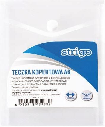 Teczka kopertowa STRIGO w formacie A6, o układzie pionowym, to niezbędnik na ochronę dokumentów! Produkt został wykonany z trwałego, połyskującego polipropylenu, w kolorze transparentnym. Dzięki temu nie ma konieczności wyciągania np.: legitymacji szkolnej na zewnątrz, ponieważ materiał jest przejrzysty. Zamykana jest na zatrzask, co gwarantuje wygodę użytkowania. Odznacza się wytrzymałością od tradycyjnych, kartonowych teczek, ponieważ posiada podwójny szew o wysokiej wytrzymałości. Stworzona dla tych, którzy stawiają na najwyższą trwałość oraz ochronę dokumentów.
