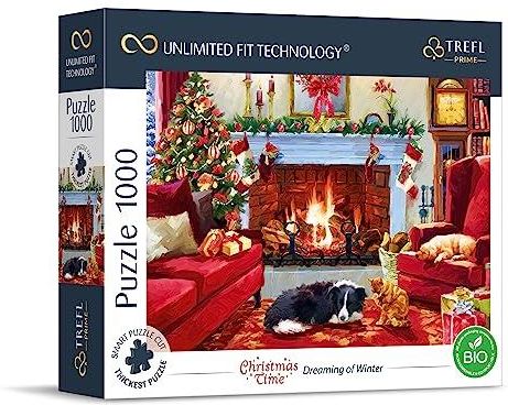 Trefl Puzzle Unlimited Fit Technology 1000el. Christmas Time: Dreaming of Winter 10754 Puzzle Trefl Prime UFT 1000 elementów, idealne dla miłośników układanek, to puzzle o specjalnych, nieregularnych kształtach, wykonane z najgrubszej tektury!  Gotowy obrazek o wymiarach 683 x 480 mm przedstawia klimatyczny obrazek, dzięki któremu poczujesz magię świąt. Możesz go przenosić, obracać oraz łączyć z innymi układankami z serii Prime UFT, w tym samym rozmiarze, w jeden duży kolaż! Produkt posiada certyfikat FSC, a wszystkie plastikowe elementy użyte do jego zapakowania są kompostowalne i biodegradowalne Świetny trening pamięci, rozwój zdolności manualnych, ćwiczenie koncentracji, cierpliwości i spostrzegawczości Przejdź na wyższy poziom układania! To coś dla prawdziwych miłośników puzzli. Seria Trefl Prime UFT obudzi w Tobie kreatywność i da niesamowitą frajdę. Specjalna technologia pozwala na łączenie dowolnej ilości obrazów w jedną dużą kompozycję. Wybierz ulubione wzory i twórz niekończącą się układankę! Przenoś i obracaj Chcesz przenieść swoją układankę,  ale boisz się, że się rozsypie? Bez obaw!  Dzięki silnej strukturze i specjalnej metodzie cięcia  sprawnie przeniesiesz swoje puzzle w inne miejsce. Ekologia jest dobra! Z troski o środowisko, poszczególne elementy stworzyliśmy z ekologicznych materiałów. Worek zsypowy oraz stickery na pudełku wykonane są z folii biodegradowalnej. Produkty nie są opakowane w folię termokurczliwą. Dodatkowo puzzle UFT są wykonane z tekstury pozyskiwanej z drewna FSC, a więc pochodzącej z lasów zarządzanych w sposób odpowiedzialny. Zmieniaj świat na lepsze razem z Nami!