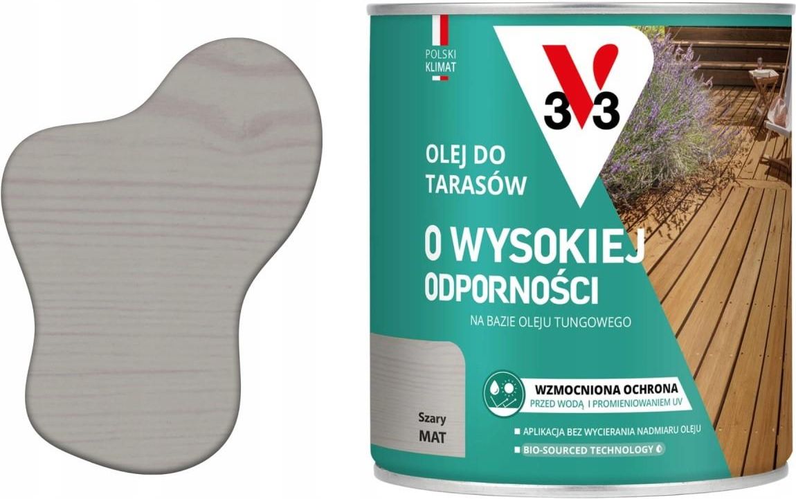 V33 Olej do tarasów o wysokiej odporności Kolor: Szary mat Pojemność: 2,5L Wydajność: 12m²/l Twój taras pod doskonałą ochroną Chcesz cieszyć się pięknem swojego tarasu bez ograniczeń? Olej do tarasów o Wysokiej Odporności V33 skutecznie i trwale chroni drewniane tarasy i meble ogrodowe przed szkodliwym działaniem wody, promieni UV i zabrudzeń. Przeznaczenie Drewniane tarasy i meble ogrodowe. Wszystkie gatunki drewna: krajowe, egzotyczne, drewno poddane impregnacji ciśnieniowej, deski kompozytowe. Właściwości Wysoka odporność: Na promieniowanie UV i niekorzystne czynniki pogodowe (deszcz, śnieg, mróz). Posiada właściwości antypoślizgowe (norma NF EN 16165). Doskonały rezultat: Olej w odcieniach drewna ożywia kolor, podkreśla usłojenie i zachowuje naturalny wygląd powierzchni. Olej w odcieniach kryjących pozwala estetycznie zabezpieczyć drewno poplamione i zszarzałe. Wiele zastosowań: Łatwość aplikacji: bez wycierania nadmiaru. Na powierzchnie pionowe i poziome. Na wszystkie rodzaje drewna. Przygotowanie Drewno musi być czyste, suche i zdrowe, wolne od wcześniejszych warstw wykończeniowych. W celu ochrony przed grzybami oraz owadami należy zastosować gruntujący impregnat biobójczy V33. DREWNO SUROWE: lekko przeszlifować drobnoziarnistym papierem ściernym i odpylić. DREWNO WCZEŚNIEJ OLEJOWANE: oczyścić i odtłuścić, zwracając szczególną uwagę na plamy i zabrudzenia, a następnie przeszlifować papierem ściernym i odpylić. DREWNO LAKIEROWANE lub POKRYTE LAZURĄ: przeszlifować aż do odsłonięcia surowego drewna i odpylić. DESKI KOMPOZYTOWE: zaleca się sezonować na zewnątrz 3 miesiące przed zastosowaniem oleju. Aplikacja Temperatura stosowania od 12°C do 25°C. Unikać nakładania na gorące drewno oraz w miejscach nasłonecznionych, podczas opadów i silnego wiatru. Przed użyciem produkt należy starannie wymieszać, sięgając mieszadłem do dna puszki. Nałożyć równomiernie dwie cienkie warstwy oleju za pomocą pędzla lub wałka, przestrzegając czasu schnięcia między warstwami. Nie należy ścierać nadmiaru oleju, należy rozprowadzić go równomiernie pędzlem lub wałkiem po powierzchni. PIELĘGNACJA: Utrata koloru drewna lub pojawienie się białych plam oznacza, że konieczna jest konserwacja. Po dokładnym oczyszczeniu powierzchni należy nałożyć 1-2 warstw oleju.