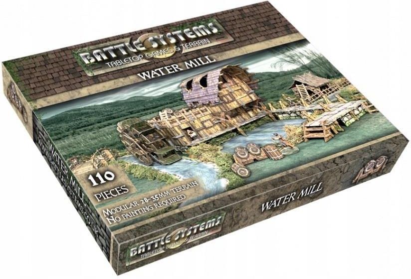 Water Mill - Idealny zestaw do dekoracji i gier Młyny wodne wykorzystują naturę do napędzania swoich maszyn. Ich kultowe koła i duże budynki fabryczne są ośrodkiem przemysłu i handlu w wielu osadach nad rzeką, chociaż to czyni je głównym celem dla najeźdźców próbujących zamknąć łańcuch dostaw… To pudełko zawiera wszystko, czego potrzebujesz do zbudowania dużego młyna wodnego, odpowiedniego do wielu gier fantasy i historycznych o średnicy 28-35 mm. Wnętrze jest w pełni szczegółowe, a dach i górne piętra są zdejmowane. Zestaw jest wyposażony w kamienne chodniki i jest kompatybilny z rzekami i jeziorami Battle Systems. Wiele elementów jest modułowych i można je montować w różnych kombinacjach lub mieszać i dopasowywać do reszty asortymentu. Teren jest dostarczany w płaskim opakowaniu na wysokiej jakości karcie o dużej gęstości, zadrukowanej w pełnym kolorze po obu stronach, więc nie jest wymagane malowanie! Teren wymaga montażu, a niektóre mniejsze części będą wymagały kleju. Zapoznaj się z samouczkiem, aby uzyskać więcej informacji i pełne instrukcje. Zawartość 1 młyn wodny 10 paneli ściennych 5 płytek podłogowych 1 Dach 2 panele szczytowe 2 rozpórki 5 balustrad 1 koło wodne 3 chodniki 3 kamienne platformy 6 podpór chodnikowych 9 rozpórek chodnikowych 1 Grzbiet chodnikowy 2 różne schody 2 różne drabiny 1 frezarka 2 stojaki na beczki 1 stół warsztatowy 1 krzesło 7 beczek 6 Różne komponenty i akcesoria Scatter 43 szare plastikowe klipsy Elementy zestawu są wykonane z grubej tektury, zadrukowanej obustronnie w pełnym kolorze i nie wymagają malowania. Zestaw wymaga montażu, a niektóre drobne części wymagają kleju. Symbol produktu: BS041 Producent: Battle Systems