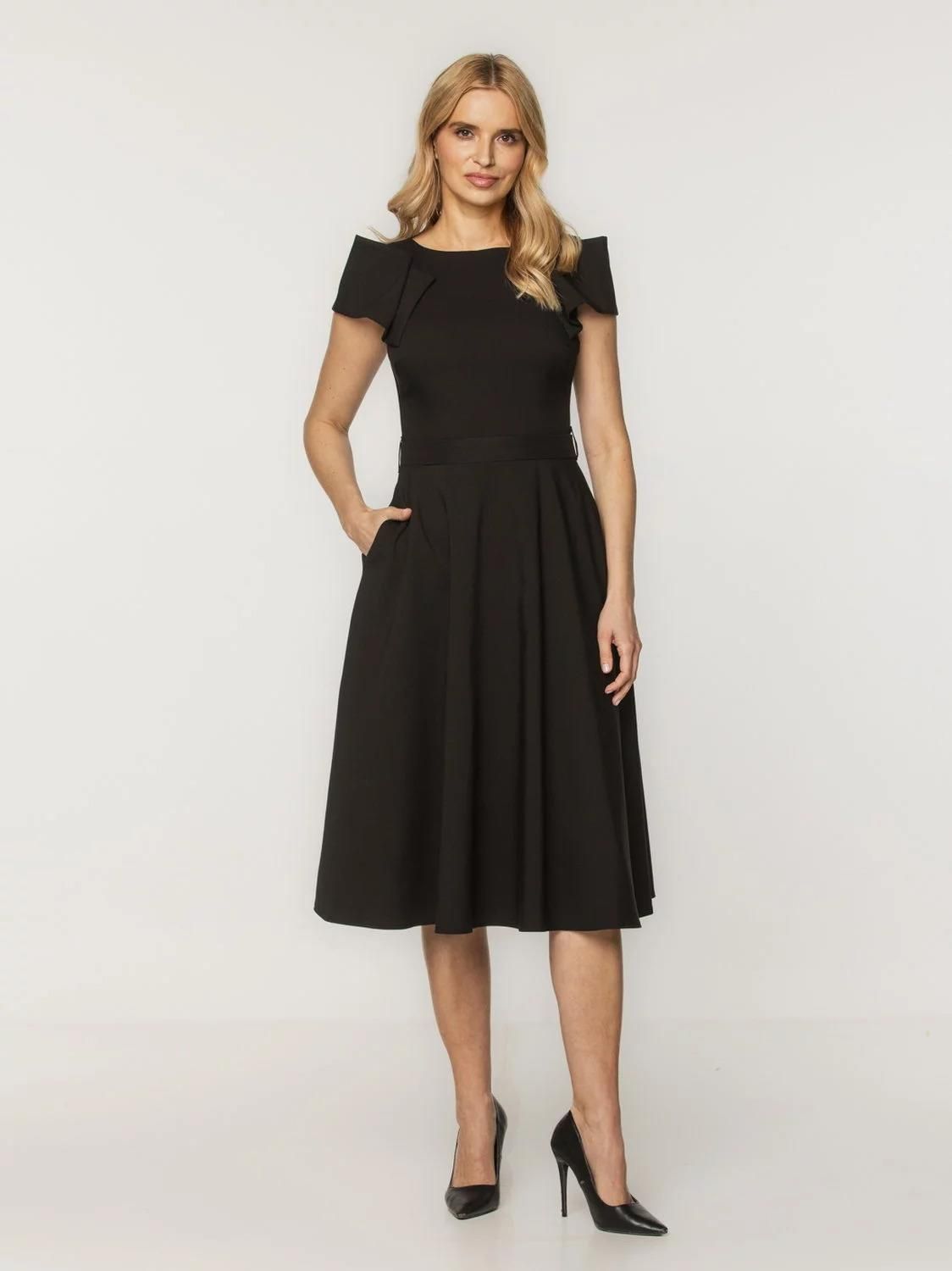Rozkloszowana sukienka MIDI Rozkloszowana sukienka o długości midi, uszyta z pełnego koła, świetnie sprawdzi się zarówno do pracy, jak i na różnego rodzaju imprezy okolicznościowe. Szerokie ramiączka, zabudowane plecy i dekolt w kształcie łódki dodają sukience elegancji oraz klasy. Forma sukienki i pasek wiązany w talii doskonale modelują sylwetkę, nadając jej kształt klepsydry. Sukienka jest zapinana na zamek błyskawiczny umieszczony na plecach. Kolor główny: czarna o gładkiej fakturze Rodzaj sukienki: rozkloszowana, długość MIDI, dekolt typu łódka, krótkie, podwijane rękawki Skład tkaniny wierzchniej: 37% wiskoza, 59% poliester, 4% elastan Skład podszewki: 94% poliester, 6% elastan Gwarancja: 24 m-ce Uszyta w Polsce