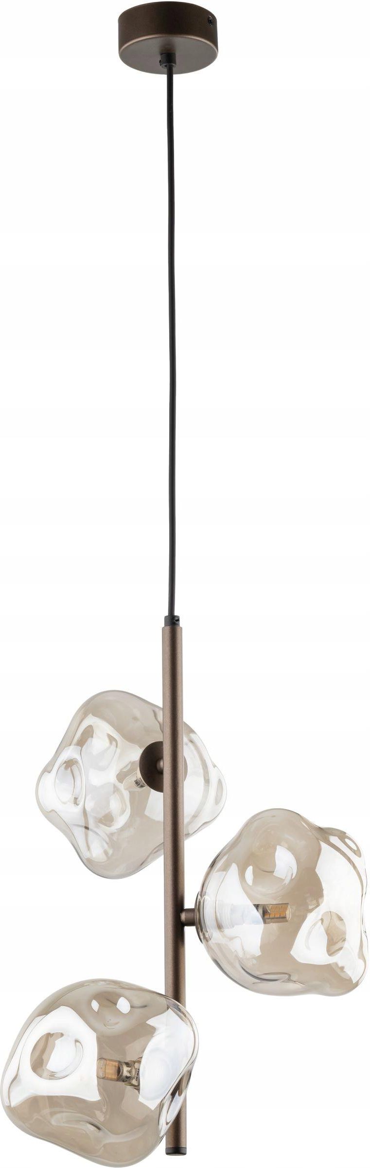 LAVA BROWN LAMPA WISZĄCA 3XG9 LAVA Rodzina lamp LAVA to połączenie nowoczesnego designu z naturalną dynamiką światła. Inspirowane płynną formą zastygłej lawy klosze ze szkła o nieregularnych kształtach nadają wnętrzu niepowtarzalny charakter. Subtelne refleksy i załamania światła tworzą efektowną grę cieni, wprowadzając do pomieszczenia atmosferę ciepła i elegancji. Metalowa konstrukcja w połączeniu z unikalnym szkłem to synonim stylu i luksusu. Kolekcja LAVA obejmuje różne warianty lamp wiszących – od minimalistycznych modeli pojedynczych po efektowne kompozycje wielopunktowe, które doskonale sprawdzą się nad stołem w jadalni, w salonie czy w przestrzeniach komercyjnych. Oświetlenie LAVA to propozycja dla miłośników designerskich rozwiązań, którzy cenią sobie harmonię światła i formy. Ilość źródeł światła: 3 Źródło światła: G9 Barwa światła: W zależności od zastosowanej żarówki Kolor stelaża: Brąz Materiał abażura - klosza: Szkło Kolor abażura - klosza: Koniak Zasilanie: 220-230V - 50/60Hz Materiał stelaża: Metal Styl lampy: Glamour Klasa ochronności: 1 klasa ochronności Dlugosc kartonu: 400 Szerokosc kartonu: 300 Wysokosc kartonu: 200 Dlugosc lampy: 290 Szerokosc lampy: 290 Wysokosc lampy: 900