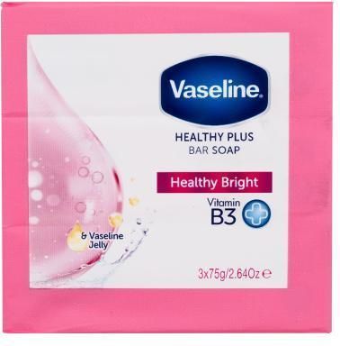Vaseline Healthy Bright Bar Soap, 3x75 g, Mydła w kostce dla kobiet, Twarde mydło Vaseline Healthy Bright to wysokiej jakości produkt do higieny ciała. Efektywnie myje skórę i usuwa wszystkie zanieczyszczenia. Właściwości: głęboko oczyszcza skórę delikatnie oczyszcza skórę nie podrażnia i nie wysusza skóry odżywia i nawilża obficie się pieni można używać do dłoni i ciała Skład: witamina B – działa nawilżająco i kojąco, łagodzi podrażnienia, wspomaga funkcjonowanie bariery ochronnej skóry, pomaga regulować wydzielanie sebum Sposób użycia: Nanieś mydło na skórę, delikatnie spień i rozsmaruj. Spłucz letnią wodą.