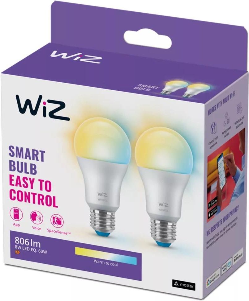 WiZ Żarówka E27 A60 8 W (60 W), zimna - ciepła biel, 2 szt. Zainstaluj wokół siebie oświetlenie stworzone z myślą o ludziach dzięki tej inteligentnej żarówce WiZ LED A60 z regulacją barwy światła białego. Stosuj różne odcienie bieli od ciepłej do zimnej, by łatwiej się skoncentrować lub zrelaksować. Możesz ustawić harmonogram włączania i wyłączania świateł zgodnie z codzienną lub tygodniową rutyną, sterować oświetleniem za pomocą smartfona lub głosu, a także mieć zdalny dostęp do świateł nawet wtedy, gdy jesteś poza domem. Światła WiZ łączą się istniejącym routerem Wi-Fi i nie wymagają dodatkowego sprzętu. DOPASUJ TRYBY ŚWIETLNE Zapisz swoje ulubione ustawienia świateł i wykorzystaj je później w dowolnym momencie. KONTROLA Z DOWOLNEGO MIEJSCA Steruj oświetleniem bez względu na to jak daleko jesteś. HARMONOGRAMY Zaprogramuj światła tak, żeby były dopasowane do Twoich codziennych czynności. RYTM DOBOWY Korzystaj z automatycznego dostosowania światła do pory dnia. Łatwa konfiguracja Czy chciałbyś mieć oświetlenie, którym możesz sterować za pomocą aplikacji na telefonie? System inteligentnego oświetlenia WiZ możesz połączyć z domowym routerem Wi-Fi i nie wymaga on żadnych dodatkowych urządzeń. Wystarczy podłączyć nowe źródło światła, pobrać aplikację WiZ i gotowe. Proste, prawda? Ciepłe białe światło Stwórz przytulną atmosferę dzięki ciepłemu, białemu światłu. Inteligentne światło, pozwala na zmianę odcienni białego światła, od ciepłego (zachód słońca) po chłodne (światło w południe). Dzięki temu możesz dostosować światło do swoich codziennych czynności i potrzeb. Zmieniaj barwę światła od ciepłej do zimnej Wybierz z szerokiej gamy energetyzującej chłodnej bieli do delikatnego ciepłego światła, jak o zachodzie słońca. Możesz również skorzystać z jednego z gotowych trybów oświetlenia, aby stworzyć najlepszą atmosferę dopasowaną do Twoich zajęć. Regulowana jasność Oświetlenie WiZ pozwala na przyciemnianie i rozjaśnianie światła. Zrobisz to za pomocą aplikacji WiZ, WiZmote (pilota), a nawet głosu. Aplikacja WiZ jest dostępna zarówo dla systemu Android oraz iOS. Szukaj w Google Play pod hasłem WiZ oraz w App Store pod hasłem WiZ Connected.  Sterowanie głosem Systemem inteligentnego oświetlenia WiZ możesz sterować również za pomocą głosu. Dzięki komendom głosowym możesz aktywować (włączyć, wyłączyć, przyciemniać, rozjaśniać) oświetlenie WiZ z pomocą systemów rozpoznawania głosu takim jak Asystent Google, Alexa (Amazon) oraz Siri. Zaprogramowane sceny świetlne Skorzystaj z gotowych schematów oświetlenia w aplikacji WiZ. Dzięk nim dopasujesz światło do swojego rytmu dobowego, zaczynając od światła dziennego, gdy potrzebujesz energii i skupienia, a następnie płynnie  zmień barwę na ciepłą , aby pomóc Ci się zrelaksować i lepiej spać.