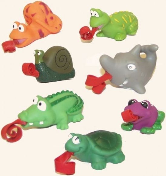 Zwierzęta ze zwijanym językiem tym razem w bardzo kolorowej i wyposażonej w naprawdę bardzo długie języki, wersji. Żaba, jaszczurka, ślimak... wybór jest szeroki i zachęca do stworzenia całej kolekcji. Jak działa zabawka? Wystarczy ścisnąć gumowe zwierzątko, a natychmiast wystrzeli swój język na całą długość. Wymiary: 91x129 mm