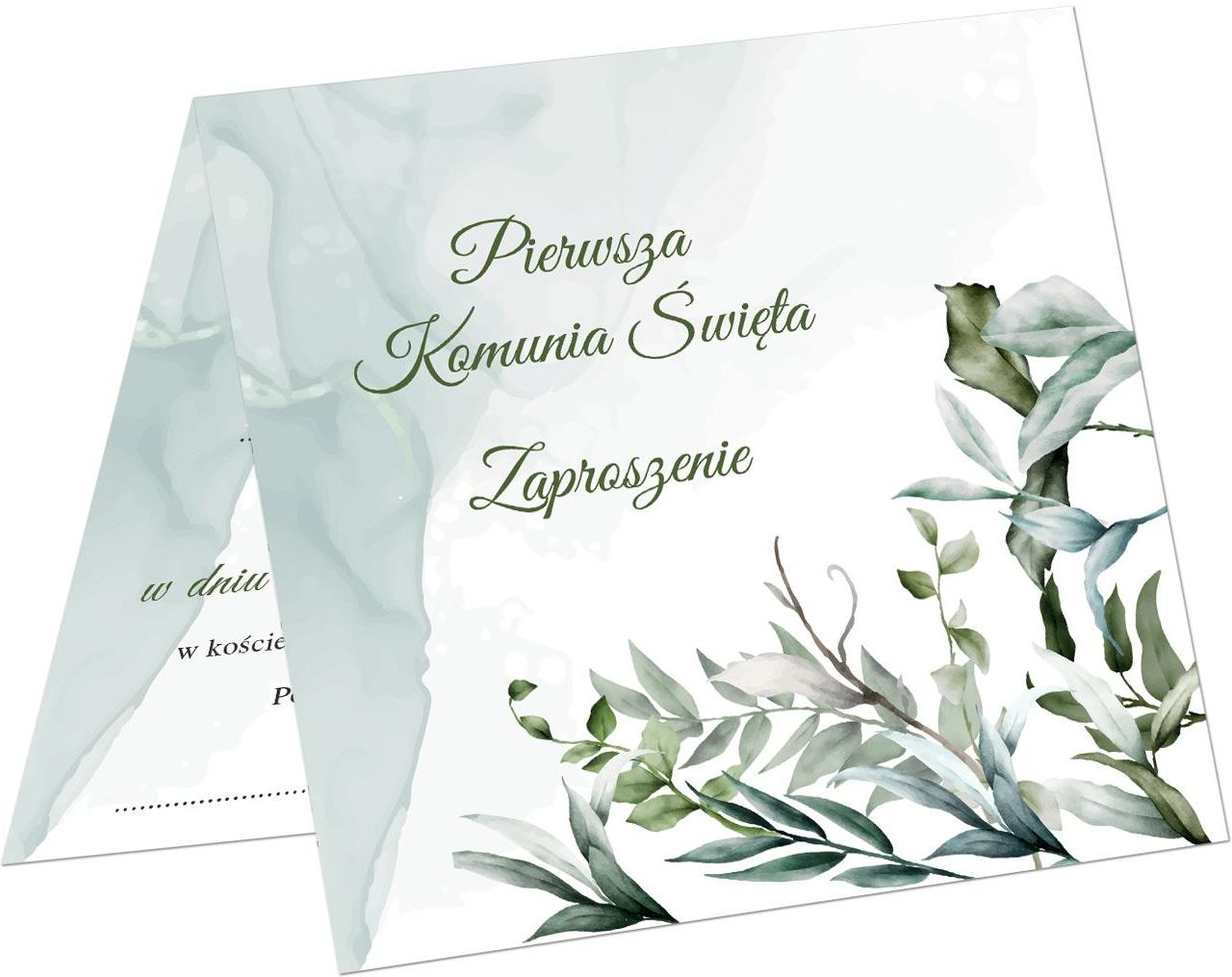 Zaproszenia na I Komunię Świętą - 6 szt. Kod produktu: ZAP-KOM30 Przepiękne zaproszenie rozkładane na I Komunię Świętą w motywie delikatnych zielonych liści. W komplecie znajdują się koperty do zaproszeń. 6 szt. zaproszeń komunijnych składanych oraz 6szt kopert. Zaproszenia wykonane są w bardzo subtelnych barwach, wydrukowane wysokiej jakości drukarką cyfrową na grubym papierze 250g. Rozmiar zaproszeń: 14 x 14 cm. Ilość w komplecie: 6 szt. Na okładce znajduje się tytuł: Zaproszenie na I Komunię Świętą, w środku W środku zaproszenia znajduje się tekst do samodzielnego uzupełnienia: ........................................ wraz z rodzicami z radością pragnie zaprosić ........................................ na uroczyste przyjęcie SAKRAMENTU I KOMUNII ŚWIĘTEJ, które odbędzie się w dniu .................. o godzinie ............ w kościele ..................................... Po nabożeństwie zapraszamy serdecznie na uroczyste przyjęcie do ........................................ Zaproszenia nie zawierają wstążki w komplecie! Wstążki są dostępne na innych naszych aukcjach.