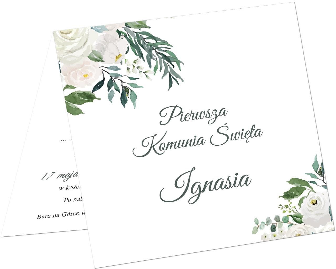 Zaproszenie personalizowane na I Komunię Świętą w motywie zielonych delikatnych liści i kwiatów. W komplecie znajduje się kraftowa koperta. Wymiary: 14x14 cm (14x28). Opakowanie: 6 szt.