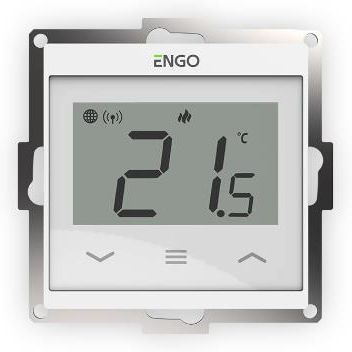 ENGO CONTROLS E55W230WIFI Internetowy, podtynkowy regulator temperatury do ramki 55x55, Wi-Fi, 230V Podtynkowy regulator temperatury do montażu w ramce 55×55 mm. Przeznaczony do kontroli ogrzewania płaszczyznowego charakteryzującego się dużą bezwładnością cieplną. Może również sterować każdym innym typem ogrzewania, a także systemami chłodzącymi – zgodnie z potrzebami i ustawieniami użytkownika. Wbudowany moduł Wi-Fi umożliwia łatwą instalację i obsługę systemu grzewczego za pomocą aplikacji mobilnej ENGO Smart. • Zaprojektowany do montażu w ramce o popularnych wymiarach 55 x 55 mm • Pracuje w standardzie Wi-Fi – nie wymaga „bramki internetowej” • Wygodnie programowany i obsługiwany w aplikacji ENGO Smart • Steruje ogrzewaniem lub chłodzeniem • Jest mały i elegancki – ma minimalistyczny design Ramka nie wchodzi w skład zestawu Cechy produktu kompatybilność z aplikacją ENGO Smart (w technologii Tuya Cloud) algorytm TPI idealny dla ogrzewania podłogowego wykresy z historią temperatur (dostępne w aplikacji) funkcja GRZANIE/CHŁODZENIE możliwość ustawienia minimalnej i maksymalnej temperatury zadanej możliwość udostępnienia urządzeń wielu użytkownikom możliwość podłączenia dodatkowego czujnika temperatury EFS300 regulowana siła podświetlenia wyświetlacza powiadomienia push z aplikacji DANE TECHNICZNE Zasilanie: 230V AC 50Hz Zakres regulacji temp.: 5 – 45°C Max. obciążenie: 3 (1) A Precyzja pomiaru: 0.1°C Algorytm sterujący: TPI Histereza (±0.2°C do ±2.0°C): Komunikacja: Wi-Fi 2,4 GHz Wejście S1 – S2: Czujnik temp. podłogi lub pomiar temp. powietrza Wyjście sterujące: NO/COM (beznapięciowe) Wymiary [mm]: 55 x 55 x 39 (17 po montażu w puszcze śred. 60)