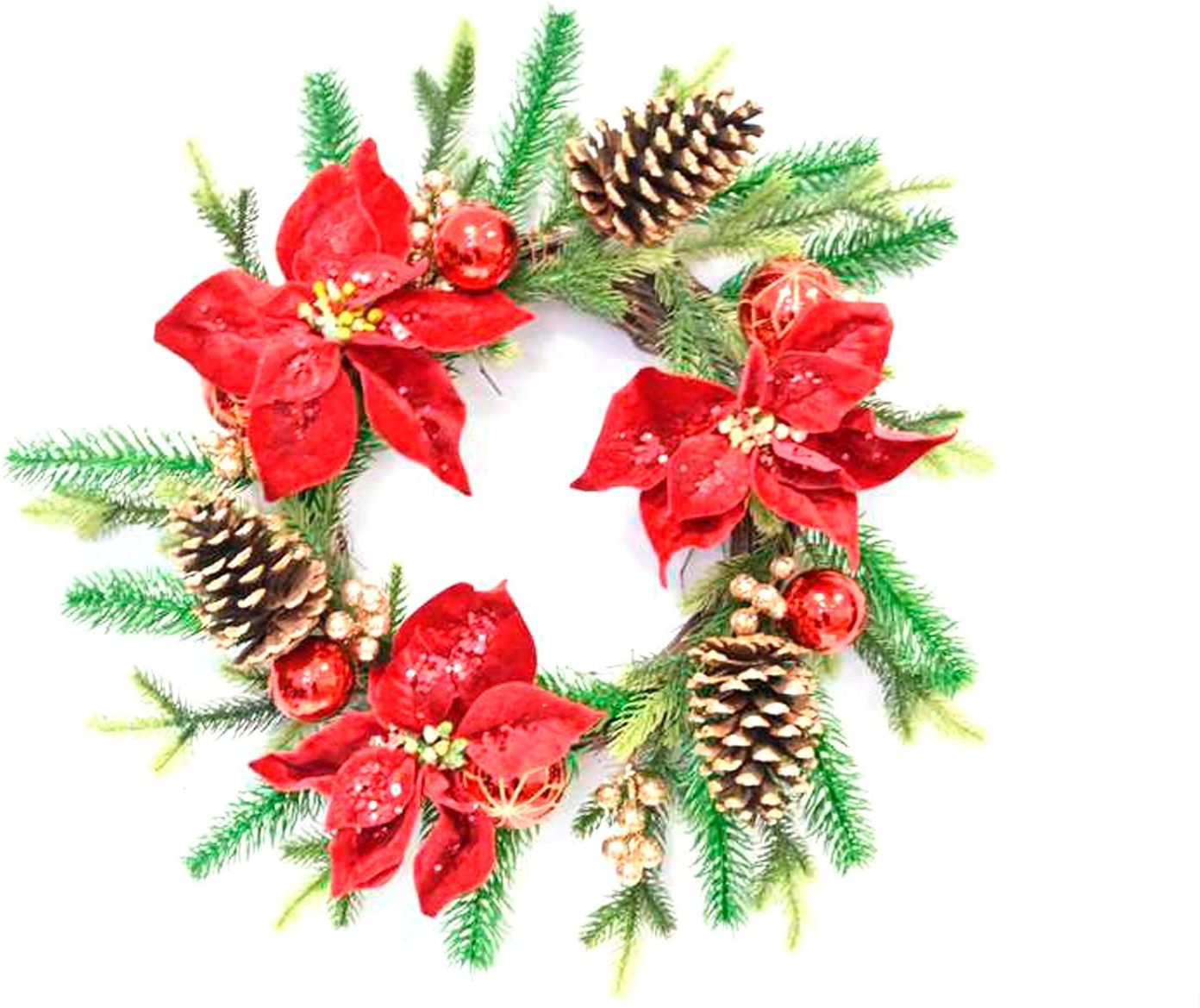 Dekoracja wisząca wianek z gałązkami świerku, szyszkami, gwiazdą betlejemską i głogiem na Boże Narodzenie. Średnica: 50 cm Opakowanie: 1 szt.