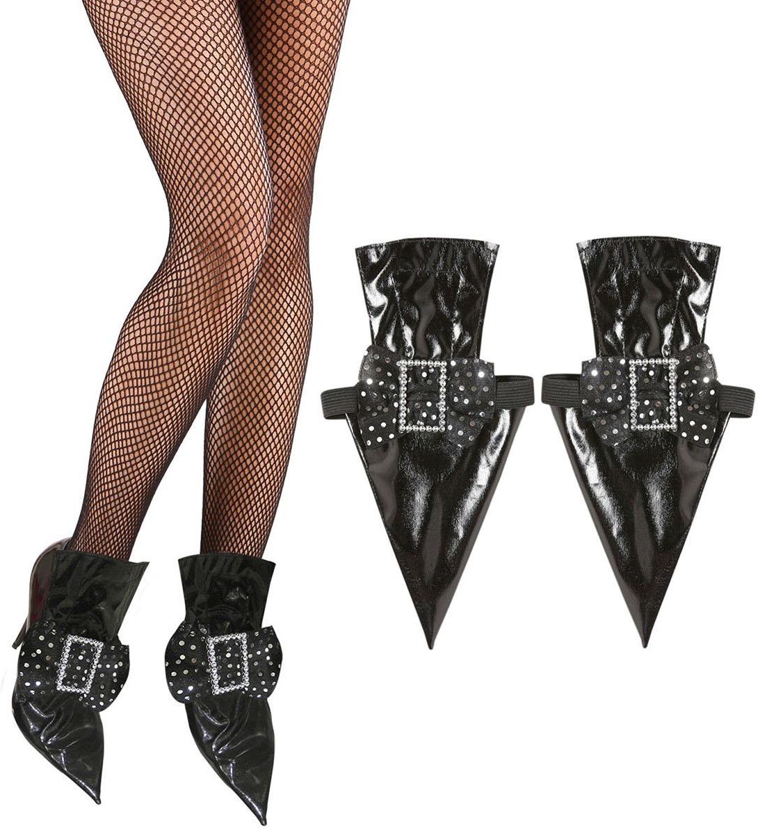 NAKŁADKI NA BUTY CZAROWNICY Nakładki na buty. Kolor: czarny. Posiadają kokardkę ze srebrną klamrą i cekinami. Mocowane na gumkach. Może służyć jako dodatek lub uzupełnienie stroju na Halloween. Na pozostałych naszych aukcjach oferujemy: Różnego rodzaju akcesoria, peruki, maski, zestawy do charakteryzacji oraz stroje dla dorosłych i dzieci. Nakładki na buty czarownicy wiedźmy Halloween