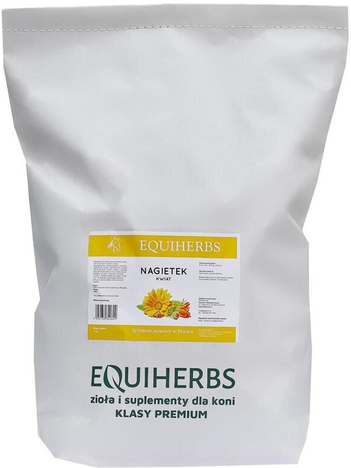 Nagietek Kwiat EQUIHERBS Dla Koni 1000g 🌼 Naturalne wsparcie dla skóry, błon śluzowych i trawienia! Dlaczego warto wybrać nagietek? 🌟 Nagietek (Calendula officinalis) to roślina o wyjątkowych właściwościach: Działa antyseptycznie i przeciwzapalnie – idealny przy chorobach skóry, ranach i stanach zapalnych. Pobudza regenerację tkanek i ziarninowanie, przyspieszając gojenie. Hamuje rozwój grzybów i bakterii – wspiera walkę z infekcjami. Wspomaga trawienie i odtruwa organizm, przydatny również przy wrzodach żołądka. Zastosowanie Przemywanie ran – po ukąszeniach, otarciach, stanach zapalnych pyska i okolic oczu. Leczenie chorób skóry – świąd, wysypka, podrażnienia. Wsparcie trawienia – poprawia funkcjonowanie układu pokarmowego. Odtruwanie organizmu – wspiera naturalne procesy detoksykacji. Skład 100% Nagietek kwiat (Calendula officinalis) – naturalny, wysokiej jakości składnik. Forma: płatki – łatwe w użyciu i przygotowaniu. Dawkowanie 🐎 Konie 500-600 kg: 30-40 g dziennie. 🍴 Sposób podania: wymieszać z paszą treściwą. Jak przygotować napar z nagietka? Zalej płatki nagietka wrzątkiem. Odstaw na 15-20 minut do zaparzenia. Przecedź i ostudź. Używaj do przemywania ran, stanów zapalnych lub podawaj z paszą. Daj swojemu koniowi naturalne wsparcie! 💚 Wybierz EQUIHERBS Nagietek Kwiat i zapewnij swojemu koniowi zdrową skórę, sprawne trawienie oraz szybką regenerację. 🐎