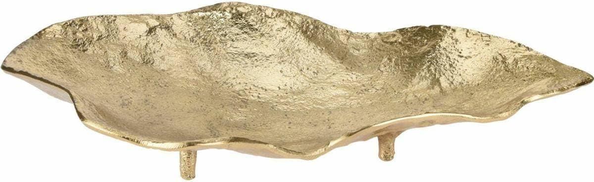 Patera w kolorze złota dekoracja glamour Piękna złota patera o nieregularnych kształtach, to dekoracja od której ciężko oderwać wzrok. Wykonana z aluminium jest lekka i można postawić ją za równo na półce jak i na stole lub komodzie. Może służyć jako samodzielna ozdoba lub do ekspozycji np. owoców, ciastek itp. Idealny pomysł na prezent. Specyfikacja: wymiary: 36х21х7 cm, materiał: aluminium, kolor: złoty, waga 540 g.