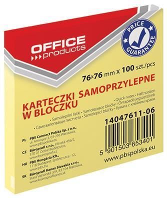 Bloczek samoprzylepny OFFICE PRODUCTS, 76x76mm, 1x100 kart., pastel, jasnożółte Czerwionka-Leszczyny