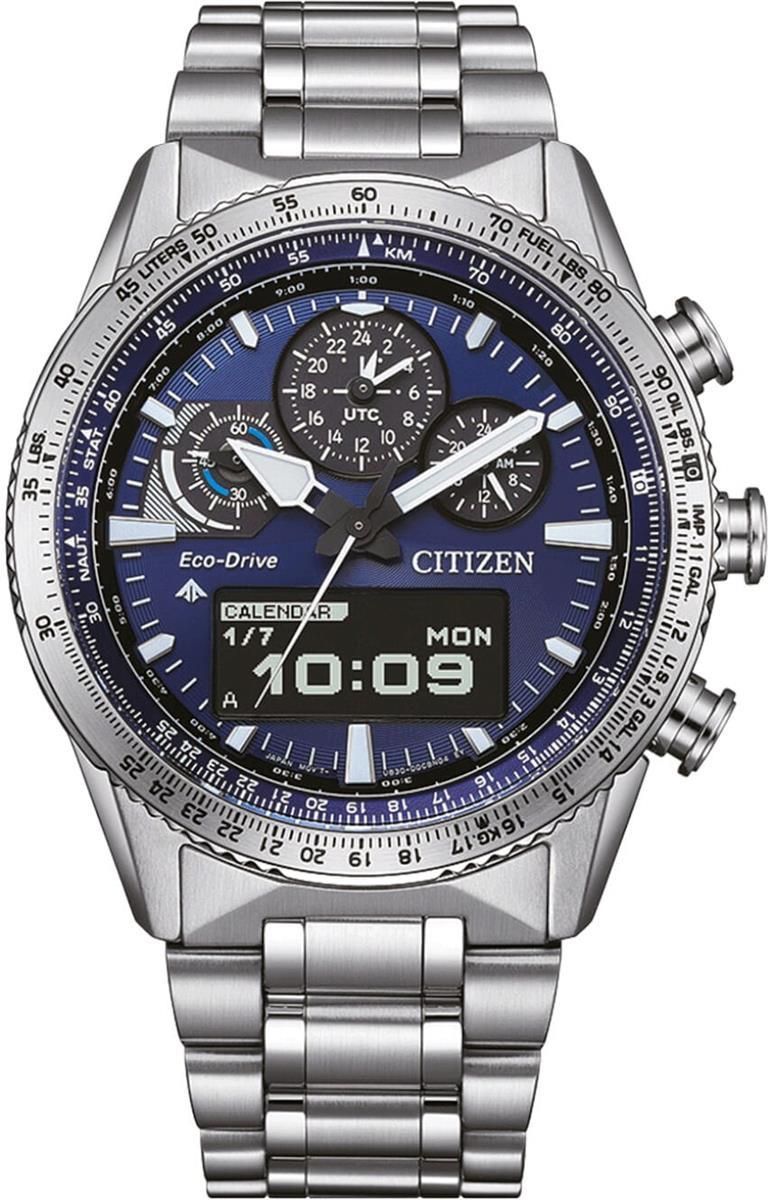 Zegarek męski Citizen JV2000-51L – zaawansowana precyzja w hybrydowej formie Zegarek męski Citizen JV2000-51L to nowoczesny, hybrydowy model łączący wskazania analogowe i cyfrowe, stworzony z myślą o miłośnikach technologii i precyzyjnych narzędzi. Jego lotniczy charakter, pełen funkcjonalności i wysokiej wytrzymałości, czyni go idealnym wyborem dla użytkowników, którzy oczekują czegoś więcej niż klasycznego czasomierza. Solidna konstrukcja, wodoszczelność 200 m oraz mechanizm solarny Eco-Drive sprawiają, że JV2000-51L jest gotowy na każdą sytuację. Technologia Eco-Drive – zasilanie światłem Zegarek działa w oparciu o mechanizm solar Eco-Drive, który wykorzystuje energię światła do ładowania akumulatora. Dzięki temu nie ma konieczności wymiany baterii, a funkcja oszczędzania energii wydłuża czas działania w trybie ciemności. To rozwiązanie ekologiczne, praktyczne i niezawodne. Konstrukcja dopasowana do wymagających użytkowników Koperta wykonana ze stali szlachetnej wyróżnia się solidnością oraz ciekawym, niestandardowym kształtem. Średnica 43 mm i grubość 14 mm nadają zegarkowi wyrazisty, męski charakter, jednocześnie zachowując komfort noszenia. Wodoszczelność na poziomie 200 m (20 bar) oraz zakręcany dekiel gwarantują odporność nawet podczas aktywności w wodzie. Zestaw wskazań – analogowe i cyfrowe jednocześnie Połączenie klasycznych wskazówek z cyfrowym wyświetlaczem pozwala na wygodne korzystanie z wielu funkcji jednocześnie. Niebieska tarcza z cyframi arabskimi jest doskonale czytelna za dnia, a dzięki powłoce luminescencyjnej oraz podświetleniu LED – również w ciemności. Najważniejsze funkcje modelu Chronograf – precyzyjny stoper, Czas dobowy 12/24h, Kalendarz, Funkcja oszczędzania energii, Podświetlenie LED zapewniające idealną widoczność w nocy. Szkło szafirowe i solidna bransoleta Tarczę chroni wyjątkowo odporne na zarysowania szkiełko szafirowe. Zegarek wyposażono także w stalową bransoletę z regulacją obwodu, zakończoną zapięciem zatrzaskowym z zabezpieczeniem. Jej szerokość przy kopercie wynosi 22 mm, a maksymalny obwód to 20 cm. Funkcjonalność zamknięta w lotniczym stylu Citizen JV2000-51L wyróżnia się charakterystycznym lotniczym designem, łącząc funkcjonalność, wytrzymałość i nowoczesne rozwiązania technologiczne. To zegarek dla mężczyzny, który potrzebuje rozbudowanego narzędzia na co dzień, jednocześnie ceniąc precyzję i solidność japońskiego wykonania.