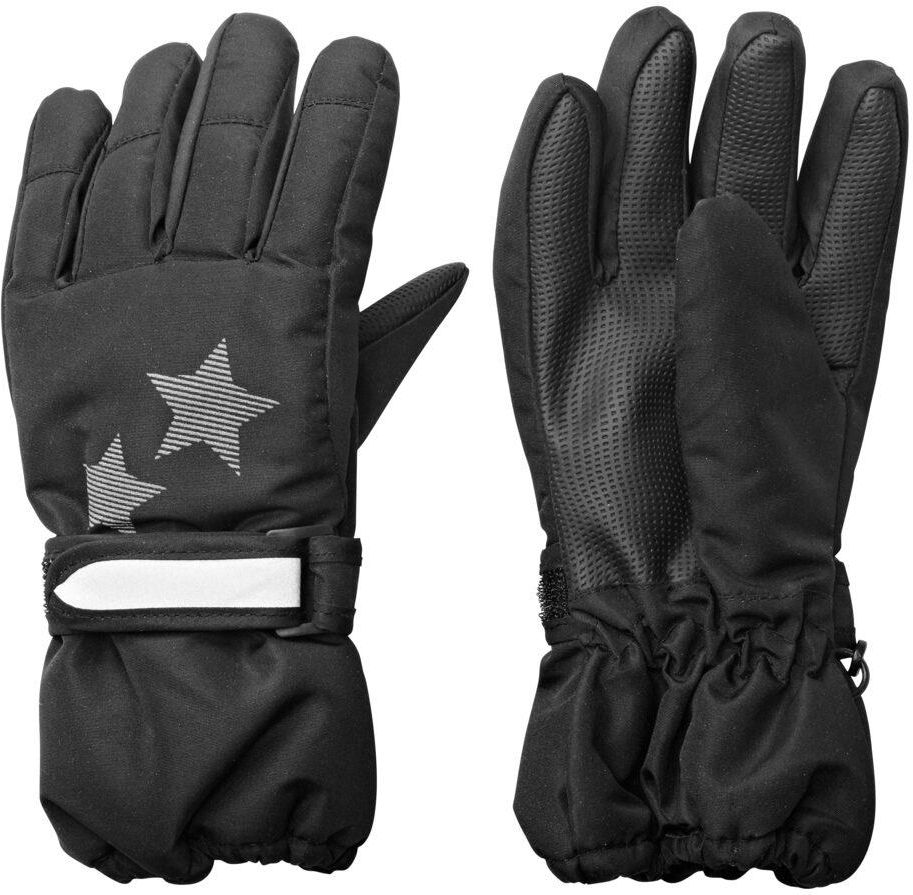 Dziecięce rękawice narciarskie z elementami odblaskowymi.Dziecięce rękawice narciarskie marki Kayoba Outdoor z elementami odblaskowymi zabezpieczają dziecięce dłonie przed zmarznięciem podczas wyjazdu na narty. Te rękawice z polarową podszewką są wodoodporne i zostały wyposażone w zapięcie na rzep na nadgarstku. Części chwytne wyposażono w materiał poliuretanowy, a na mankietach znajduje się taśma elastyczna, która zapobiega przed przedostawaniem się śniegu do środka rękawic. Elementy odblaskoweCałkowicie czarne rękawice mają elementy odblaskowe w kształcie gwiazdek na zapięciu na rzep oraz na grzbiecie dłoni.