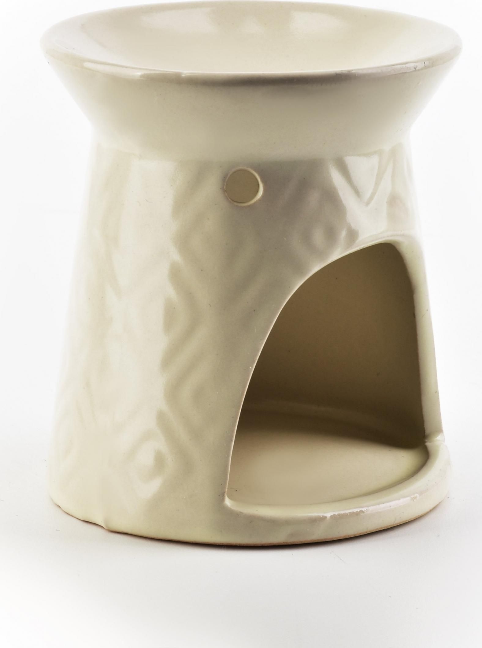 Kominek na wosk lub olejek zapachowy marki Mondex, wykonany z ceramiki. Kominek jest koloru kremowego, błyszczącego, z ozdobnym, tłoczeniem w kształcie rombów. Naczynie umożliwia rozpylenie zapachu wosku lub olejku zapachowego. Do użycia potrzebna jest świeczka typu tealight, którą umieszcza się w środku kominka. Kominek nie tylko spełnia funkcję użytkową, ale będzie również doskonałą dekoracją. Górna część kominka pełni funkcję pokrywki na miseczkę z woskiem. Znajdujące się na ściankach kominka otwory sprawiają, że światło umieszczonego w środku tealighta może wydobywać się na zewnątrz, tworząc migoczącą grę cieni. Idealnie sprawdzi się on zarówno w pomieszczeniach, jak i na balkonach, tarasach czy ogrodach. Modny i klimatyczny kominek będzie ozdobą, która umili Ci każdy wieczór. Wzór: HTTP7677 Produkt 1 x kominek na wosk zapachowy Wymiary średnica górna 8,3 cm średnica dolna 8 cm wysokość 9 cm Materiał ceramika