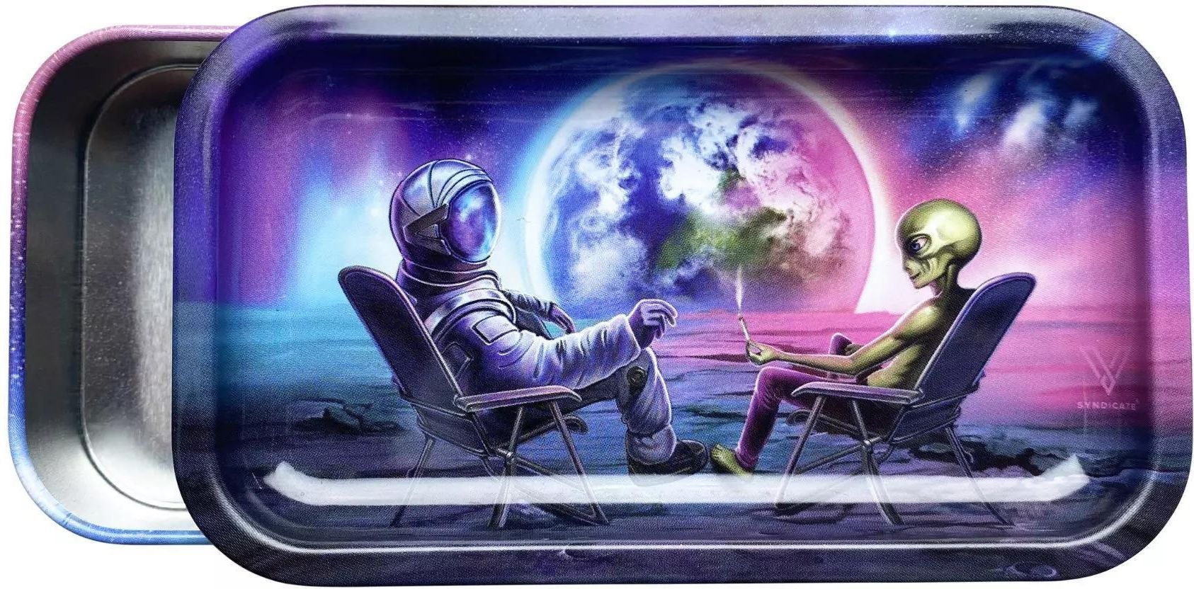 Schowek bezzapachowy z tacką Syndicase BLUNT ORBIT Wodoodporny schowek na susz z pokrywą w formie tacki. Nadruk: BLUNT ORBIT. Wykonany z wysokiej jakości stopu cyny. Schowek nie przezpuszcza zapachów, pozwala zachować świeżość przechowywanego suszu.