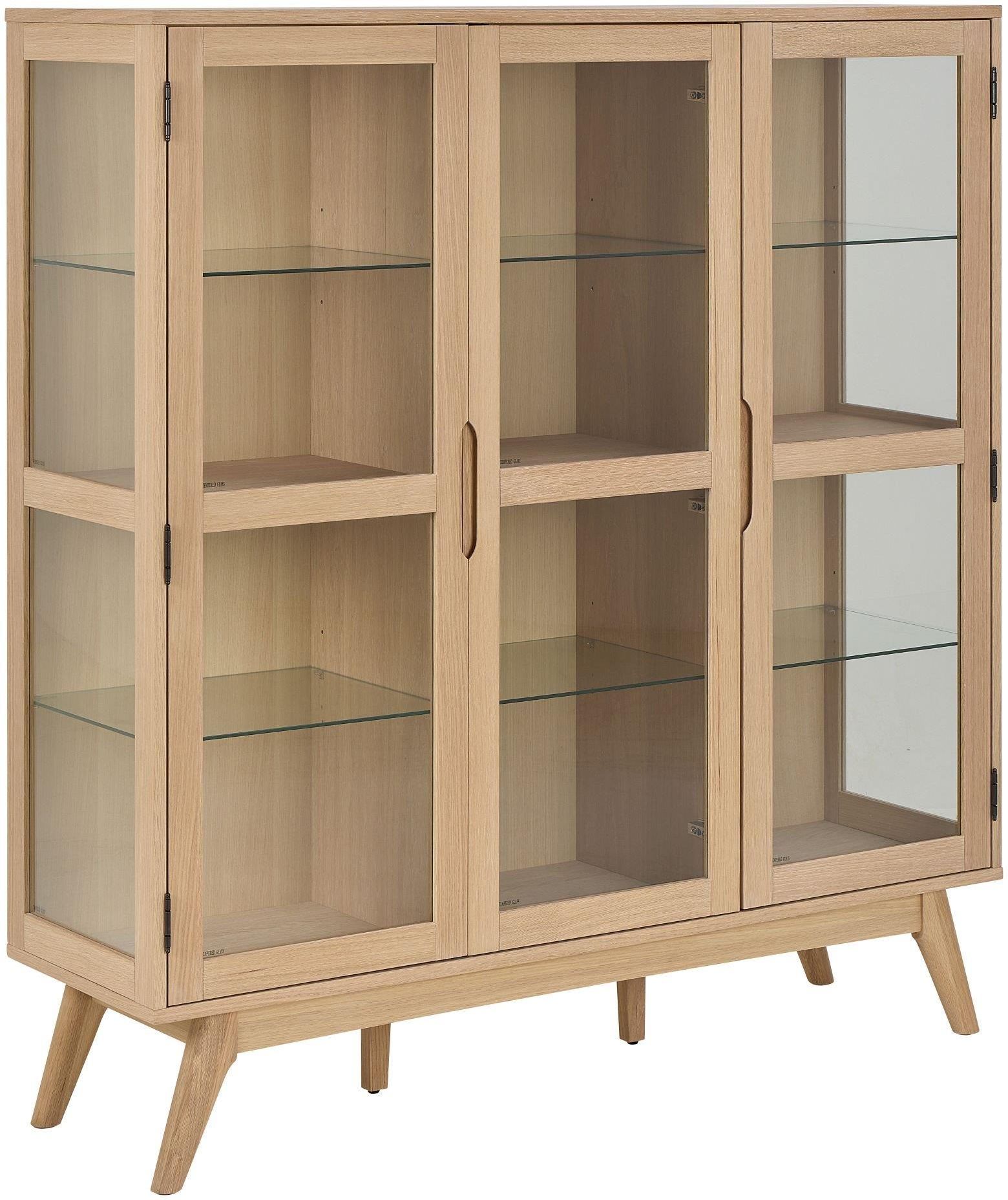 WITRYNA MARTE II 140X40X148 cm DĄB BIELONY Elegancka witryna do jadalni lub salonu w stylu skandynawskim znajdzie zastosowanie w wielu wnętrzach. Witryna wykonana z forniru dębowego w połączeniu ze szklanymi drzwiami i zgrabnymi nóżkami ładnie będzie się prezentować w każdym wnętrzu. Witryna oferuje mnóstwo miejsca do przechowywania naczyń i dekoracji dzięki 9 półkom za szklanymi drzwiami. Oparta na solidnych, ukośnych nogach, witryna emanuje skandynawskim charakterem. Ta zyskująca popularność, stylowa seria jest częścią kolekcji MARTE, która obejmuje stoły, stoliki kawowe, komody oraz szafki RTV. Witryna Marte, blat, rama i podstawa z białego, olejowanego forniru dębowego, 3 drzwi z przezroczystego szkła hartowanego i białego, olejowanego forniru dębowego, 9 półek z białego, olejowanego forniru dębowego i przezroczystego szkła hartowanego, 140x40x148 cm