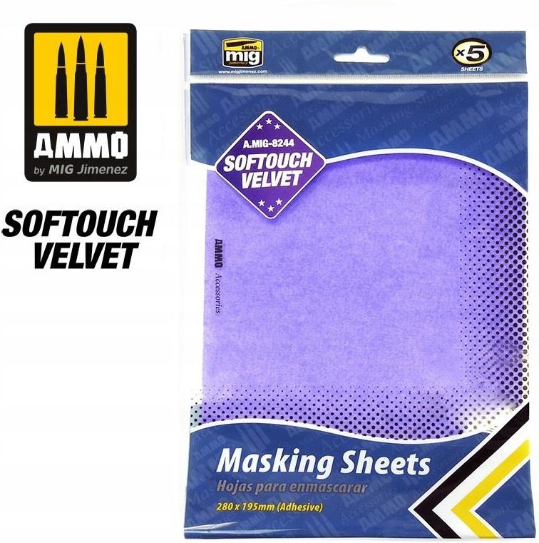 Ammo by Mig: Softouch Velvet Masking Sheets - Adhesive (280 x 195 mm) (5) Ammo: Softouch Velvet Masking Sheets to arkusze maskujące do stosowania przy malowaniu przy pomocy aerografu, jest kompatybilny ze wszystkimi rodzajami farb.