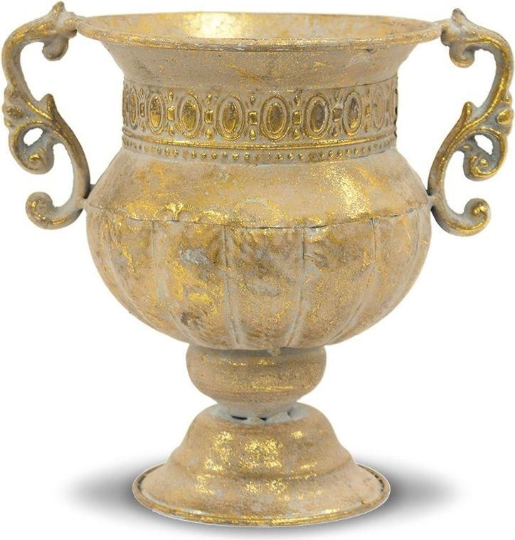 Osłonka Metalowa Nasza metalowa osłonka w kształcie pucharu to prawdziwy klejnot w świecie dekoracji wnętrz. Wykonana z trwałego metalu, emanuje luksusem i prestiżem. Jej elegancki design z pewnością przyciągnie uwagę i stanie się centralnym elementem dekoracyjnym w Twoim domu. Złote wykończenie nadaje tej osłonce wyjątkowego blasku i pozwala jej doskonale komponować się z różnymi stylami aranżacyjnymi. Możesz postawić ją na stole, półce, czy komodzie, aby dodać wyjątkowego uroku swojemu wnętrzu, albo wykorzystać ją do wyeksponowania ulubionych ozdób, kwiatów czy świec. Ta osłonka jest nie tylko pięknym elementem dekoracyjnym, ale także wyrazem Twojego indywidualnego stylu. Jej wyjątkowa wysokość (21,5 cm) sprawia, że przyciąga uwagę i nadaje się do eksponowania zarówno samodzielnie, jak i jako część większej kompozycji dekoracyjnej. Rozmiar: 21,5x21,5x16 Pakowanie: 1 Kolor: brązowy złoty Materiał: metal