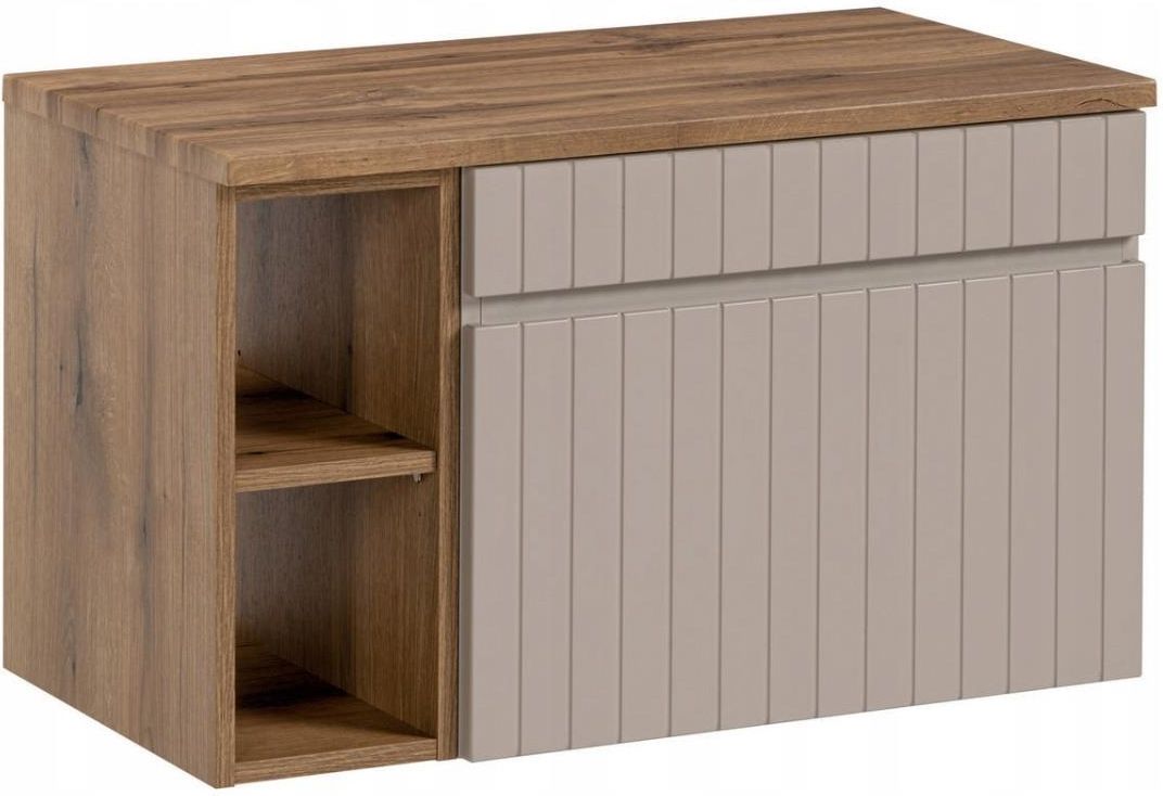 Kupując od nas - kupujesz produkt bezpośrednio od Polskiej firmy tyletegotu. Każdego dnia dokładamy starań aby nasze usługi, jak również produkty w ofercie były najwyższej jakości - setki pozytywnych opinii potwierdzają że można i warto! Dziękujemy że nas wybieracie. SZAFKA PODUMYWALKOWA DO ŁAZIENKI Iconic 80x46x46 cm Szafka podumywalkowa, Iconic, 80x46x46 cm, beżowy, mat. Niezwykle efektowna szafka wisząca z ergonomicznym układem funkcjonalnym. Dzięki nowoczesnemu, a jednocześnie uniwersalnemu stylowi pozwala na dużą swobodę w aranżacji. Dedykowany mebel idealnie sprawdzi się w każdej łazience, nie zajmując przy tym zbyt wiele przestrzeni. Najważniejsze cechy szafki podumywalkowej: Klasyczna konstrukcja Wysoka jakość wykonania Innowacyjne rozwiązanie kolorystyczne Bardzo funkcjonalna Praktyczna szuflada Ryflowane fronty Zintegrowane podchwyty Funkcja cichego domyku Idealne uzupełnienie każdej łazienki Meble produkowane w Polsce Instrukcja montażu w przesyłce Wymiary: Szerokość szafki: 60 cm Wysokość szafki: 46 cm Głębokość szafki: 46 cm Szerokość blatu: 80,4 cm Wysokość blatu: 2,5 cm Głębokość blatu: 46 cm Szerokość regału: 20 cm Wysokość regału: 46 cm Głębokość regału: 44 cm W skład zestawu wchodzi: 1x szafka wisząca pod umywalkę 1x blat łazienkowy 1x regał dolny Dodatkowe informacje: Meble należy czyścić za pomocą delikatnej ściereczki. Nie stosuj silnych środków myjących Meble do samodzielnego montażu. W opakowaniu instrukcja montażu oraz wszystkie niezbędne elementy