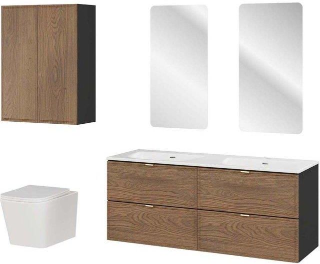 Zestaw Szafka z Podwójną Umywalką Meblową 120 cm i 2 Półsłupki oraz 2 Lustra i Sedes Talia Casella Czarny Mat Elegancki zestaw łazienkowy Talia Casella łączy matowy czarny korpus z frontami dąb Casella. Oferuje funkcjonalne dwie umywalki ceramiczne, lustra LED oraz wygodne półsłupki. System cichego domykania wzmacnia komfort. Wymiary Szerokość (cm): 120 Wysokość (cm): 50 Głębokość (cm): 46 Dane techniczne Waga (kg): 102 Zestaw składa się z: Umywalka Meblowa Ceramiczna SKY 1 120D MATT WHITE E-8099-120D Biały Mat, Lustro LED bez ramy 2 szt, Półsłupek Łazienkowy 1-drzwiowy Talia Casella 2 szt, Szafka Pod Umywalkę 60 cm 2 Szuflady Talia Casella 2 szt, Misa WC Wisząca WALL HUNG TOILET WHITE Kolor korpusu: Czarny mat Kolor frontu: Dąb Casella Kolor Uchwytu: Pakiet - Złoty Połysk, Czarny Mat, Chrom Połysk Kolor Umywalki: Biały Mat Materiał korpusu: płyta laminowana Materiał Frontu: Płyta MDF Materiał Uchwytu: Plastik Materiał umywalki: ceramika Prowadnice: Cichy domyk Umywalka w zestawie: Tak Blat w zestawie: Nie Pakiet Montażowy w Zestawie: Tak Montaż: Do samodzielnego montażu Zestaw Szafka z Podwójną Umywalką Meblową 120 cm to idealne połączenie elegancji i nowoczesności, które odmieni Twoją łazienkę. Ten wyjątkowy zestaw, stworzony z dbałością o szczegóły, zachwyca minimalistycznym stylem w matowej czerni oraz dekorze Dąb Casella, który wprowadza naturalne ciepło do wnętrza. Fronty szafki, wykończone subtelną frezowaną ramką, przyciągają wzrok i nadają meblom ponadczasowy charakter, a jednocześnie świetnie wpisują się w nowoczesne trendy aranżacyjne. Szczególnym atutem zestawu jest podwójna umywalka wykonana z ceramiki w eleganckim białym macie, która nie tylko prezentuje się wspaniale, ale także zapewnia wygodę użytkowania. Dzięki dwóm pojemnym szufladom, które wyposażono w system cichego domykania, możesz efektywnie przechowywać wszystkie niezbędne akcesoria łazienkowe, zyskując ład i porządek. Wysokość szafki wynosząca 50 cm wprowadza lekkość do przestrzeni, sprawiając, że łazienka wydaje się bardziej przestronna i zachęcająca do codziennego relaksu. Kolekcja Talia Casella daje możliwość personalizacji, dzięki trzem różnym kolorom uchwytów – złotemu połyskowi, chromowi oraz czarnemu matowi. To elastyczne podejście pozwala na dostosowanie mebli do Twojego indywidualnego stylu. Meble są wykonane z trwałych materiałów, takich jak płyta MDF i laminat, co gwarantuje wysoką jakość i długowieczność, a przy tym estetyczny wygląd przez wiele lat.