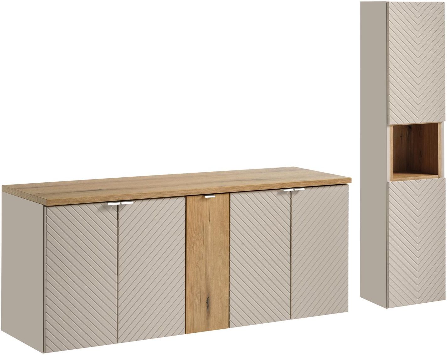 Szafka łazienkowa wisząca z blatem łazienkowym 140 cm oraz słupkiem łązienkowym Szerokość:140 Wysokość:59,5 Głębokość:40 Zestaw składa się z: Szafka łazienkowa 60 cm w kolorze kaszmirowym w ilości 2 sztuk Blatu łazienkowego 140 cm kolor dąb evoke coast Szafki łazienkowej 20 cm kolor dąb evoke coast …