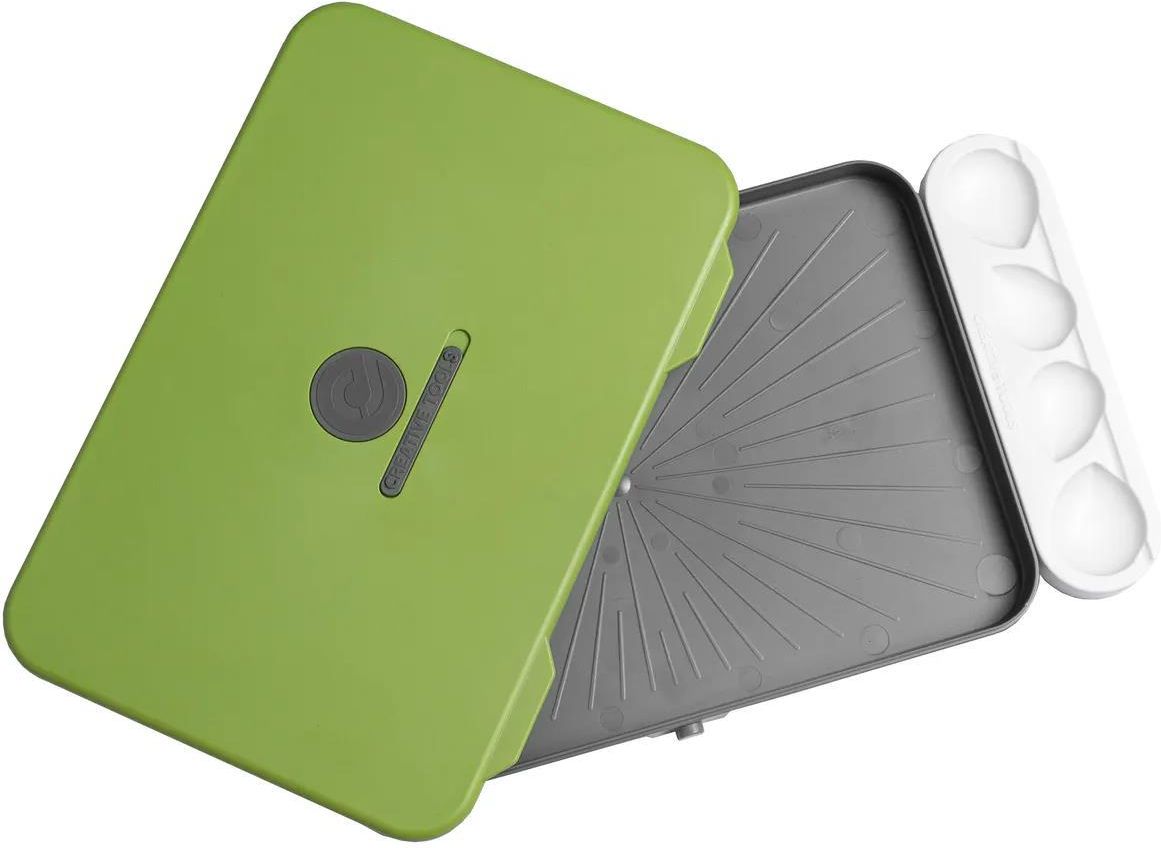 Creative Tools: Paletka do farb i tuszów (biała) Paletka do farb i tuszów pozwala na pracę ze wszystkimi środkami, których nie możesz użyć na mokrej palecie takich jak farby typu Contrast i Speedpaint, tusze, farby i washe olejne. Wykonanie z HDPE pozwala na umycie palety rozpuszczalnikami modelarskimi bez ryzyka uszkodzenia. Specjalnie zaprojektowane wgłębienie pozwala na bezpieczne odłożenie pędzelka. Innowacyjny, ergonomiczny system ułatwiający bezpieczne otwieranie i zamykanie palety to jedna z największych zalet palety, pokrywa prezycyjenie i bez użycia siły zamyka paletę, specjalne skrzydełka pozwalają na wygodne i kontrowane otwieranie palety co zapobiega rozlewaniu i mieszaniu się farby. Istotna jest także wysokość podstawy palety, zapobiega ona wylewaniu się wody przy przenoszeniu lub przesuwaniu palety. Uwaga! Produkt nie zawiera mokrej palety.
