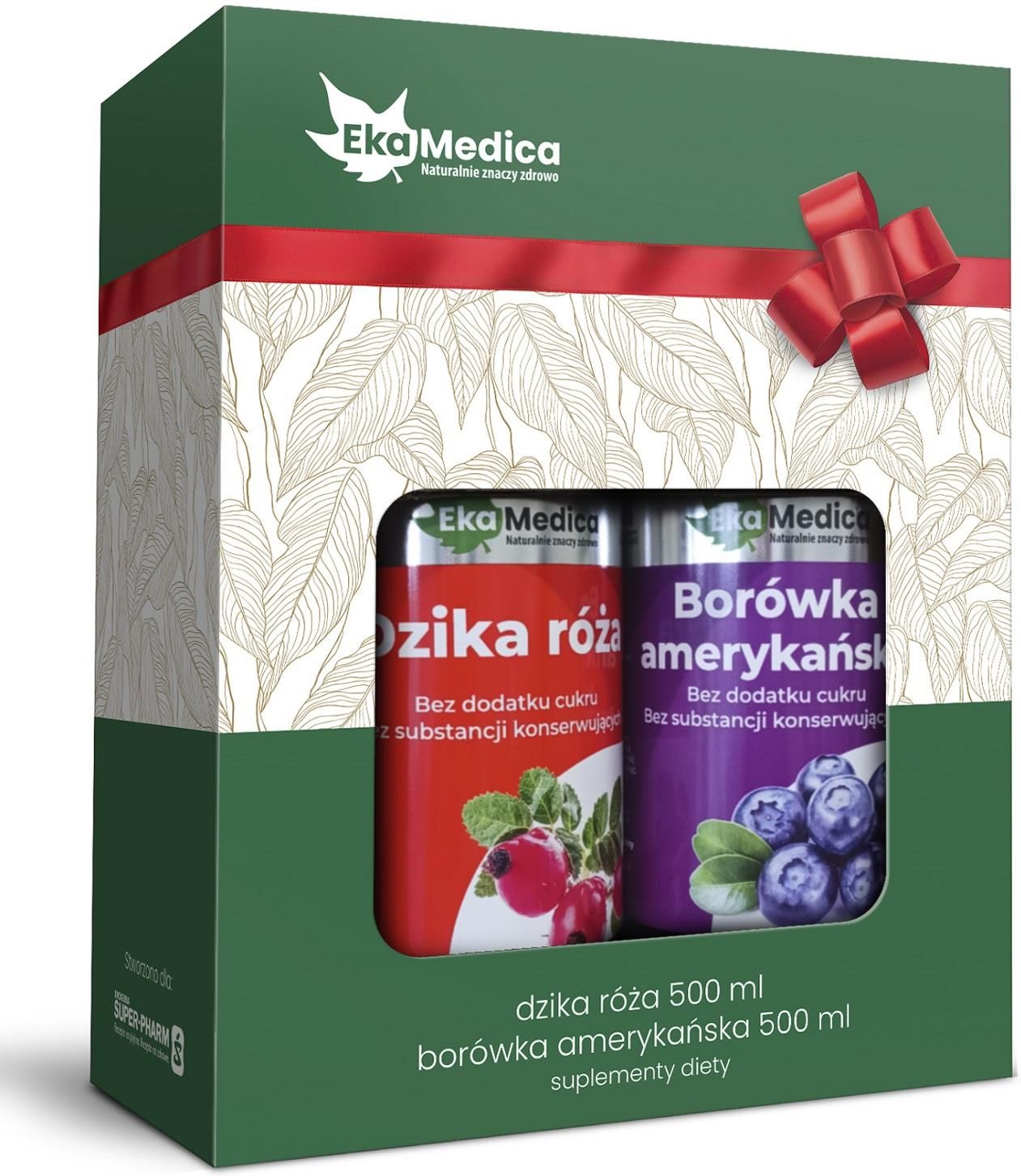 Elkamedica Zestaw Prezentowy Dzika róża 500 ml + Borówka amerykańska 500 mlZestaw zawierający dwa soki o pojemności 500 mlEkamedica Sok Borówka Amerykańska 500 mlSuplement diety w formie płynnej, wyprodukowany z soku 100% z owoców borówki amerykańskiej z dodatkiem witaminy C naturalnego pochodzenia. Pasteryzowany.Sposób użycia:Dorośli i dzieci od 3 roku życia: dwa razy dziennie po 25 ml pół godziny przed posiłkiem.Nie przekraczać zalecanej porcji do spożycia w ciągu dnia.Produkt nie może być sto