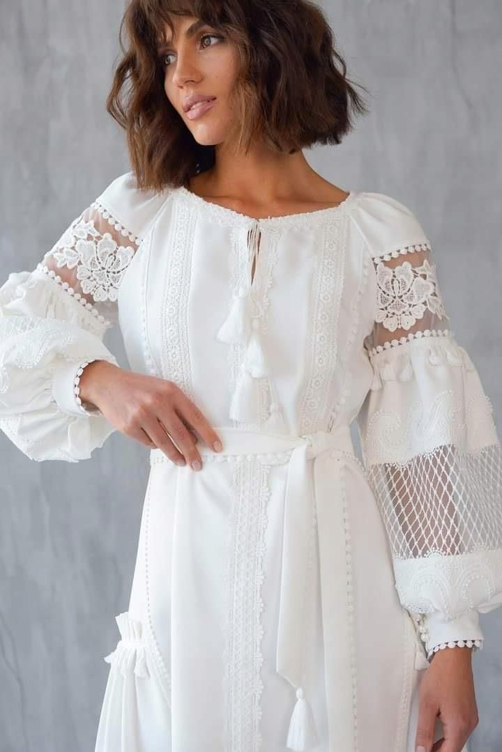Przepiękna dizajnerska suknia haftowana w białym kolorze. Ma bufiaste rękawki z delikatną koronką i piękny kwiecisty bogaty haft. Posiada w komplecie pasek z pięknymi frędzelkami. Uszyta z dużą starannością zgodnie z najwyższym standardem krawiectwa. Zadbano o każdy mały szczegół i guziczek, suknia jest prawdziwym dziełem sztuki. Pasuje do wyjściowych stylizacji, na uroczystości, ślub cywilny. Lub do innych wyjątkowych okazji. Wymiary na rozmiar 36: Biust: 88 cm Talia: 82 cm Długosc sukni: 110 cm. Polecam. Jest wyjątkowa.