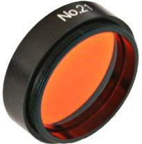 #21 Pomarańczowy Zalecane zastosowania dla tego filtra: Księżyc - bardzo przydaje się do poprawienia kontrastu między tworami powierzchniowymi w teleskopach 6" i większych, z filtrem polaryzacyjnym lub bez. Merkury - przyciemnia ziemskie niebo podczas obserwacji dziennych aby wydobyć rzadko dostrzegalne subtelne różnice albedo na powierzchni. Wenus - przyciemnia ziemskie niebo podczas obserwacji dziennych aby bardziej wyraźnie uwidocznić fazy. Mars - zwiększa kontrast czap biegunowych, obszarów zaszronionych, niskich chmur oraz burz pyłowych względem obszarów pustynnych o barwie ochry. Wyostrza także brzegi żółtych chmur pyłowych. Jowisz - uwidacznia strukturę pasów oraz wydobywa wstęgi i szczegóły w rejonach podbiegunowych. Saturn - poprawia strukturę pasów atmosferycznych i podkreśla rejony podbiegunowe o tonacji niebieskiej. Komety - można go nałożyć na filtr #38A aby poprawić kontrast pomarańczowych linii sodu D w gazowych warkoczach komet w teleskopach 10" i większych. Poprawia rozdzielczość obrazu głowy i warkoczy pyłowych w teleskopach 10" i większych. Obserwacje Słońca - stosuje się go jeśli chcemy uzyskać właściwe odwzorowanie barw gdy używamy filtra słonecznego z mylaru. Przepuszczalność 46 %.
